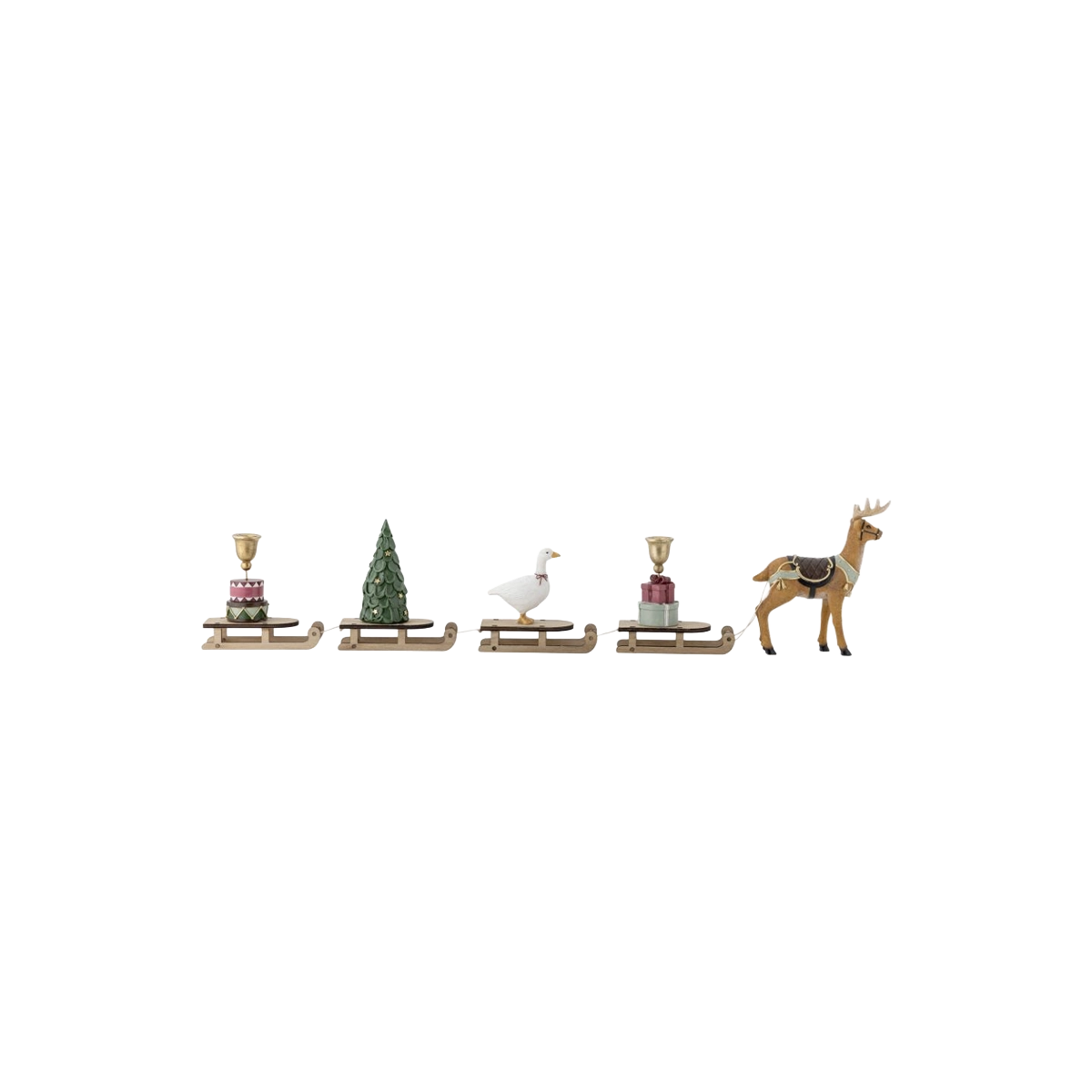The Dasher Deco by Bloomingville is a charming Christmas decoration featuring a sleigh with a Christmas tree, a goose, and a reindeer. The sleigh is adorned with two candle holders in a stunning gold finish, creating a warm and inviting atmosphere, ideal for the holiday season. Each figure is crafted from polyresin and meticulously hand-painted, ensuring that every decoration is unique.