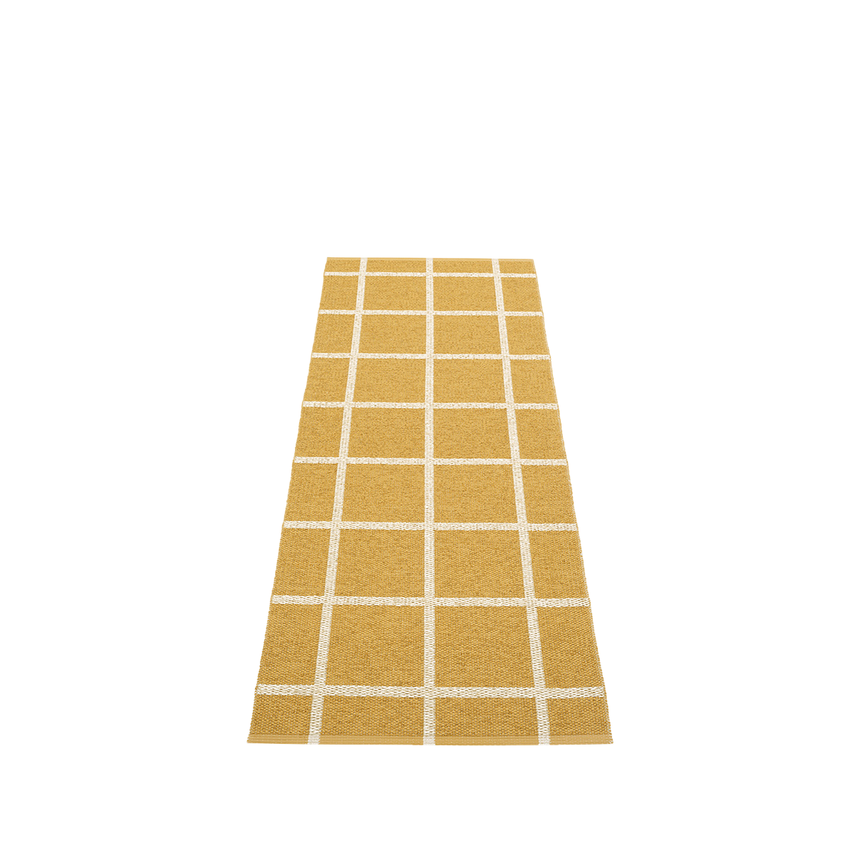 Kliva in i världen av tidlös design med ADA, en matta inspirerad av tapeter, där rutigt mönster är en bestående trend. Men ADA är mer än bara en enkel ruta. Den utmanar gränserna för traditionella vävtekniker och resulterar i en verkligt banbrytande och innovativ matta. Genom detaljerad hantverksskicklighet och en ständig strävan efter perfektion utmanade vi våra skickliga vävare att utveckla och förädla vävtekniken som används i ADA. Resultatet är en matta som kombinerar två tekniker och sömlöst möter varandra både vertikalt och horisontellt. Denna matta visar upp en revolutionerande teknik som gör den unik. Den harmoniska fusionen av vertikal och horisontell vävning skapar en hypnotiserande visuell effekt som tillför djup och sofistikering till vilket utrymme som helst. Mattan är hygienisk, absorberar ej vätska, samt dammar inte. Idealisk för personer med allergier. Pappelina plastmatta ADA Ochre Beige Metallic.