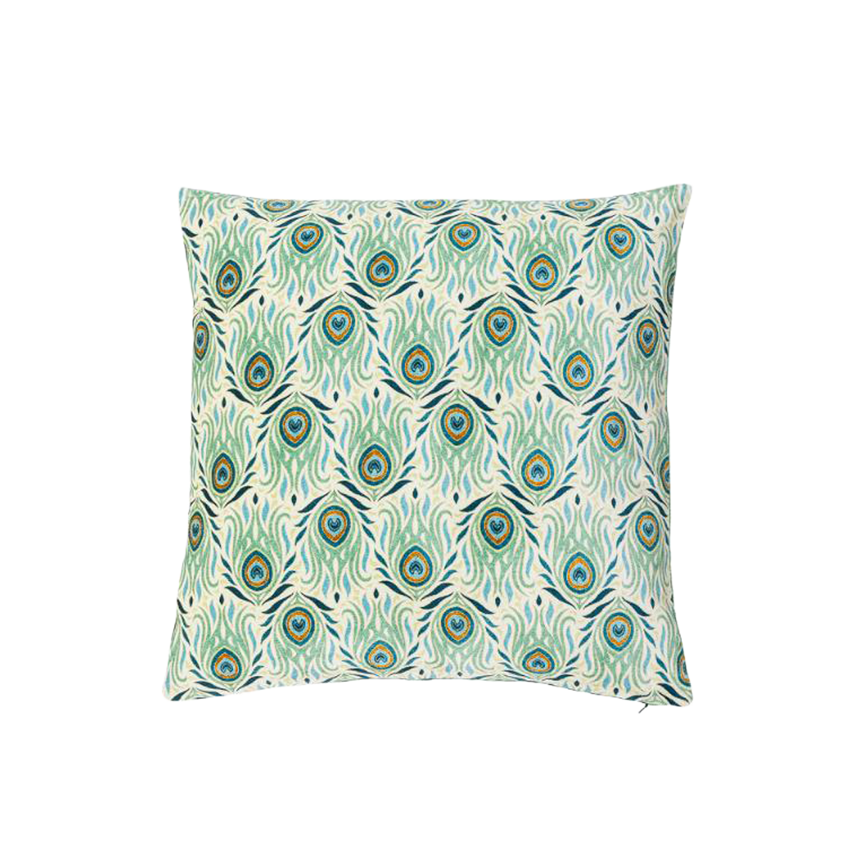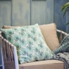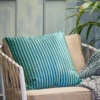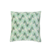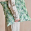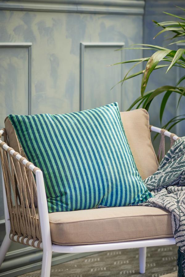 Adia kudden är tillverkad av bomull med polyesterfyllning och har en mjuk yta med velourlook. Framsidan är prydd med ett grafiskt mönster i nyanser av grönt, medan baksidan har fina ränder i samma färgschema.