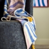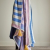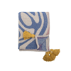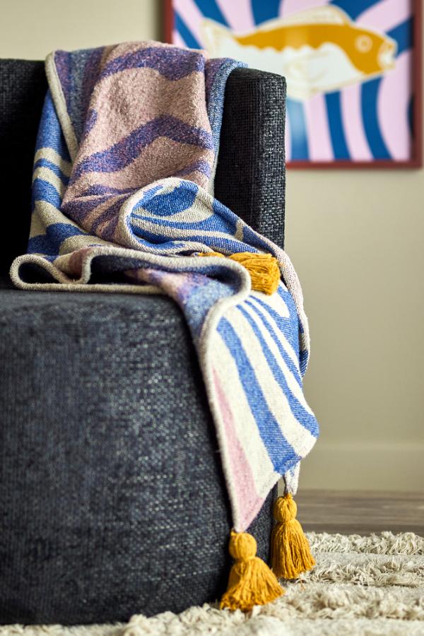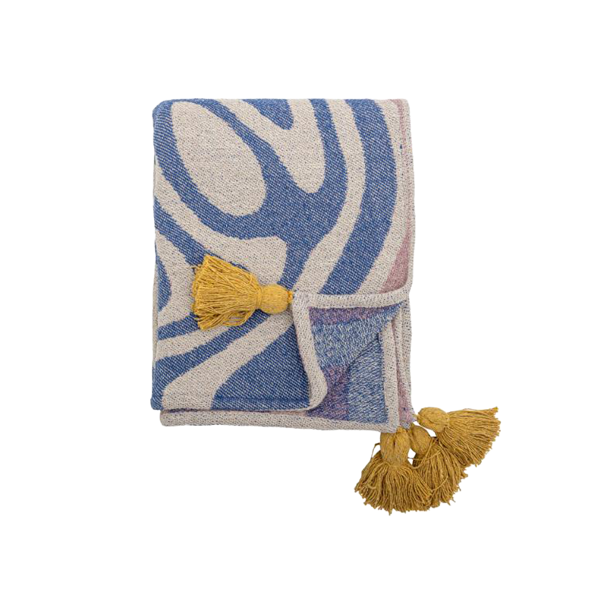 Arlie pläden är en vävd bomullstextil med ett djärvt motiv i mjukt blått och beige, accentuerat med dämpade rosa och djupt gula tofsar i varje hörn. Tyget är vävt med ett mönster i omvända färger på baksidan, vilket ger en subtil variation till designen.