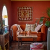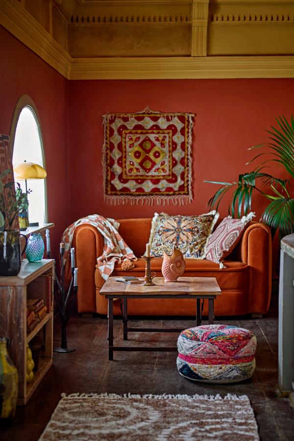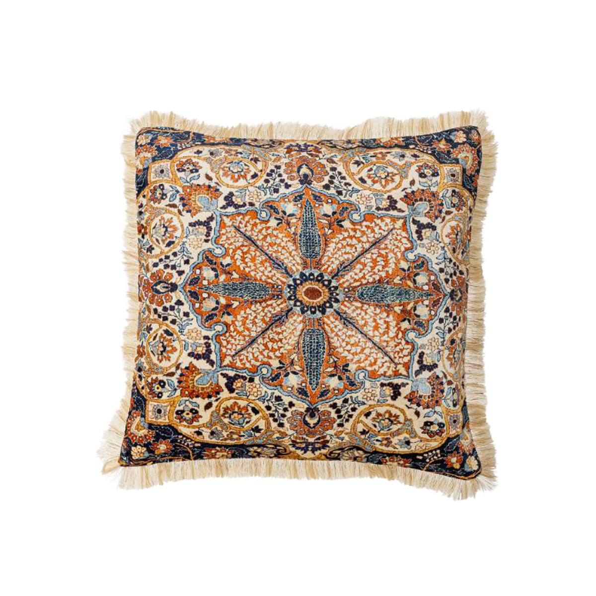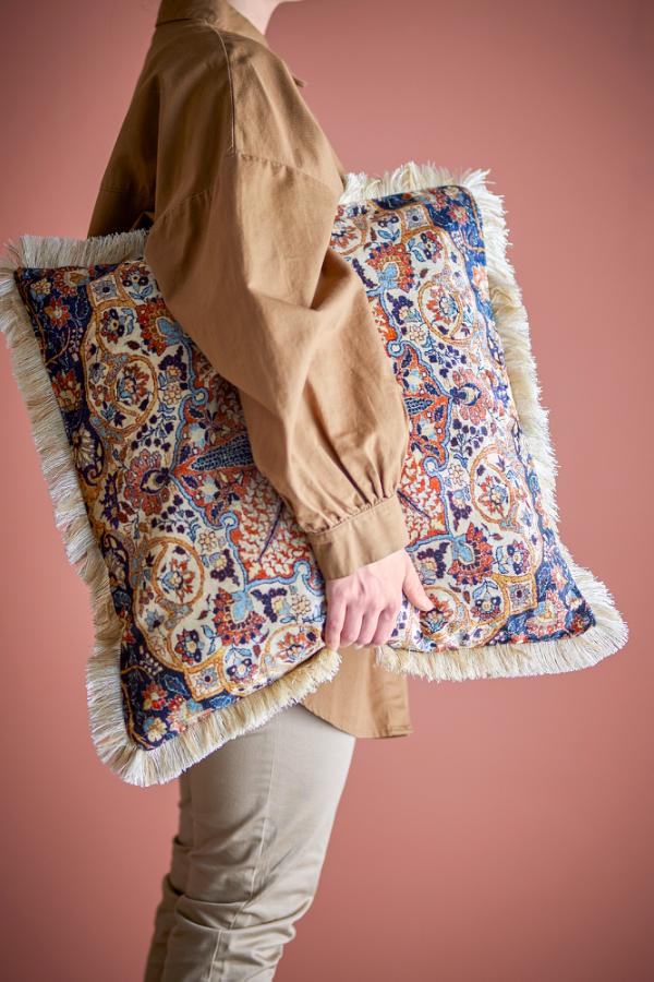 Asu-kudden är tillverkad av en viskosblandning med polyesterfyllning. Den mjuka ytan är dekorerad med ett blommotiv i varma nyanser och avslutad med en kort frans.