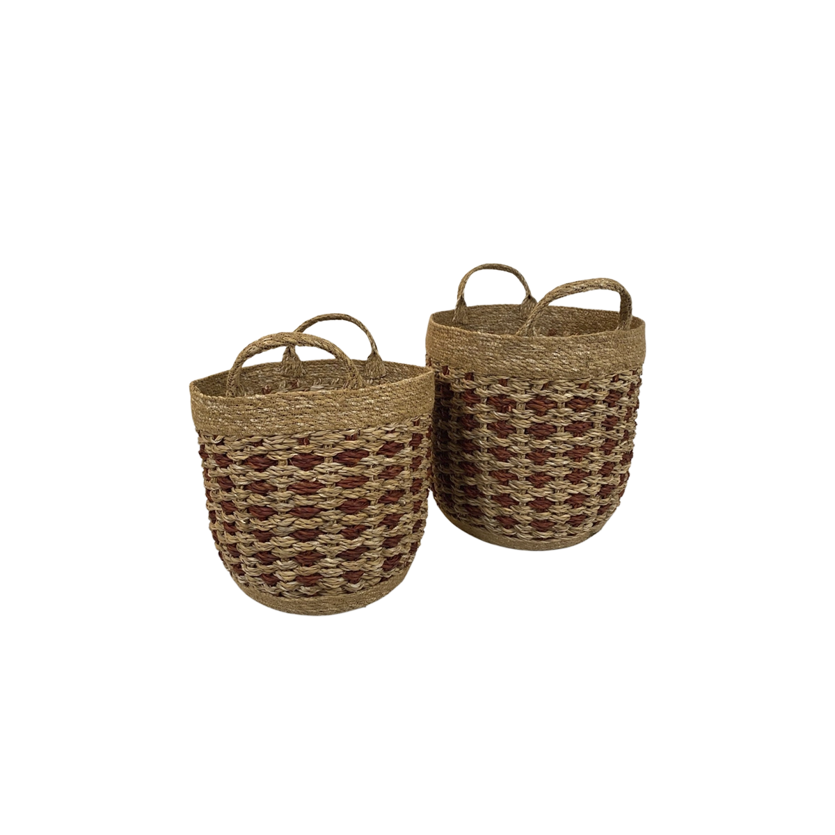 Två dekorativa korgar i sjögräs med röda detaljer. Ger både färg och funktion till ditt rum.