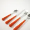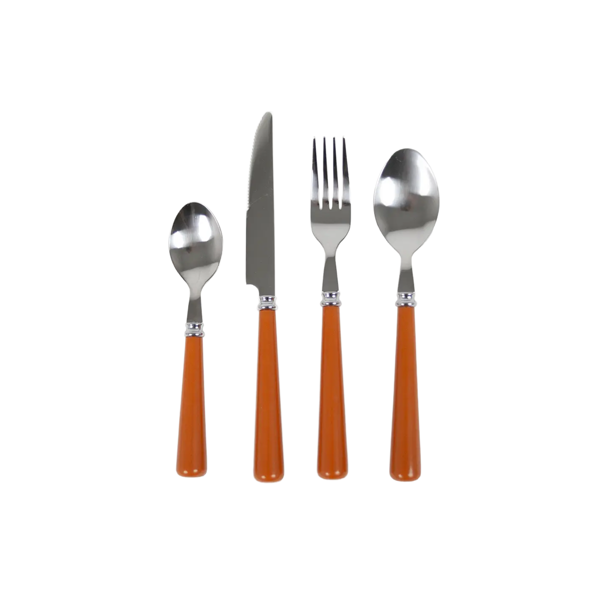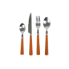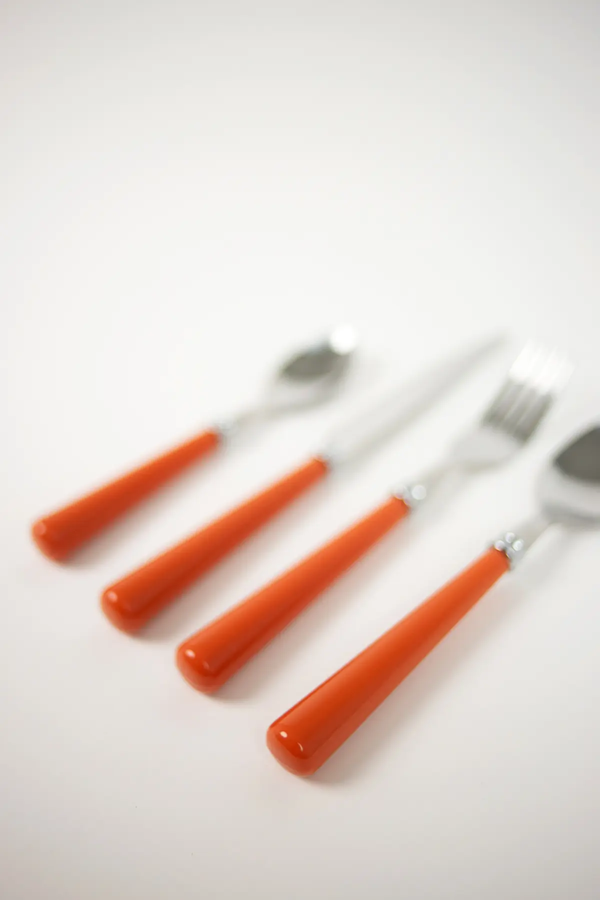 Bestick i rostfritt stål med färgade handtag i slitstark plast.