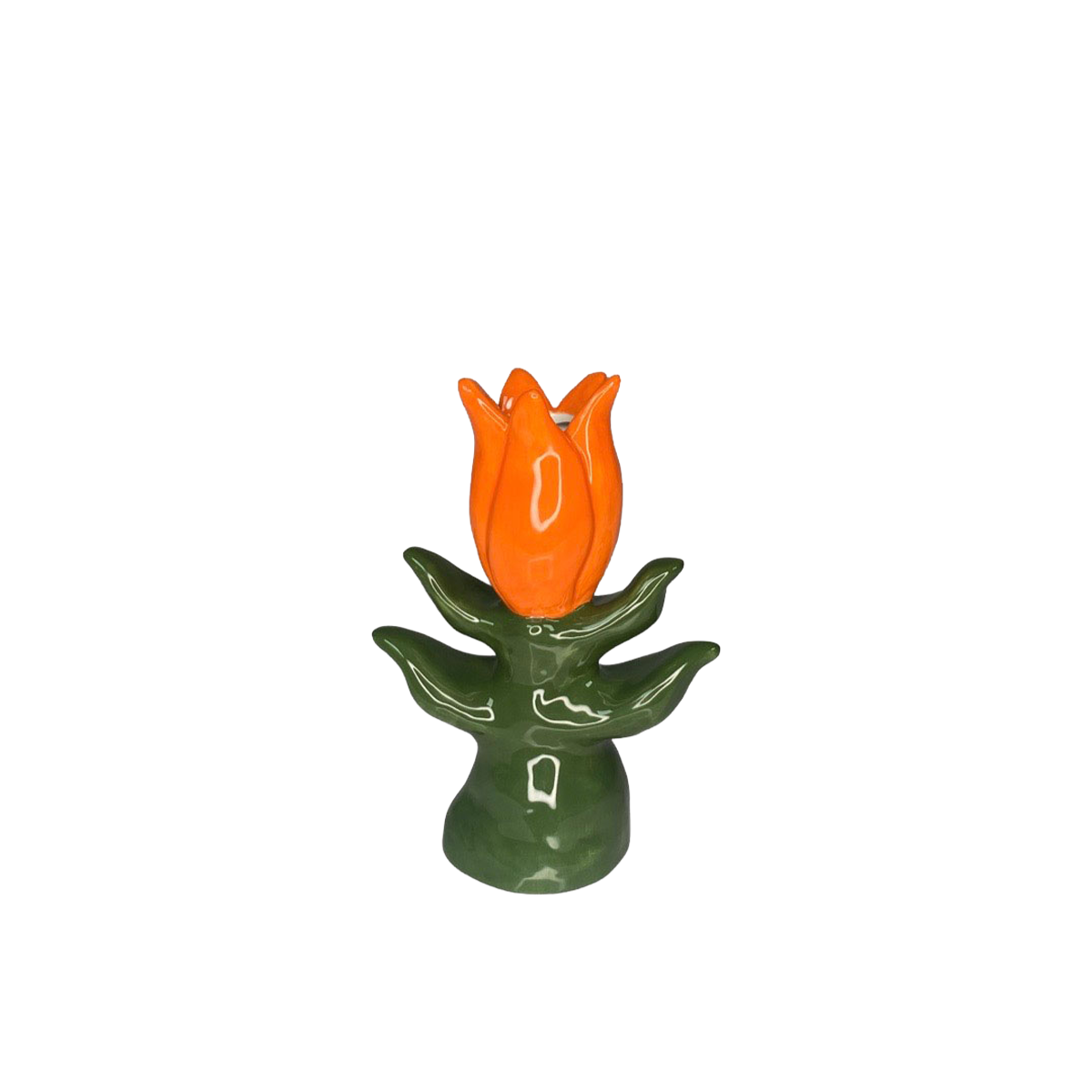 Handmålad vas med form av tulpaner. Bör endast diskas förhand.