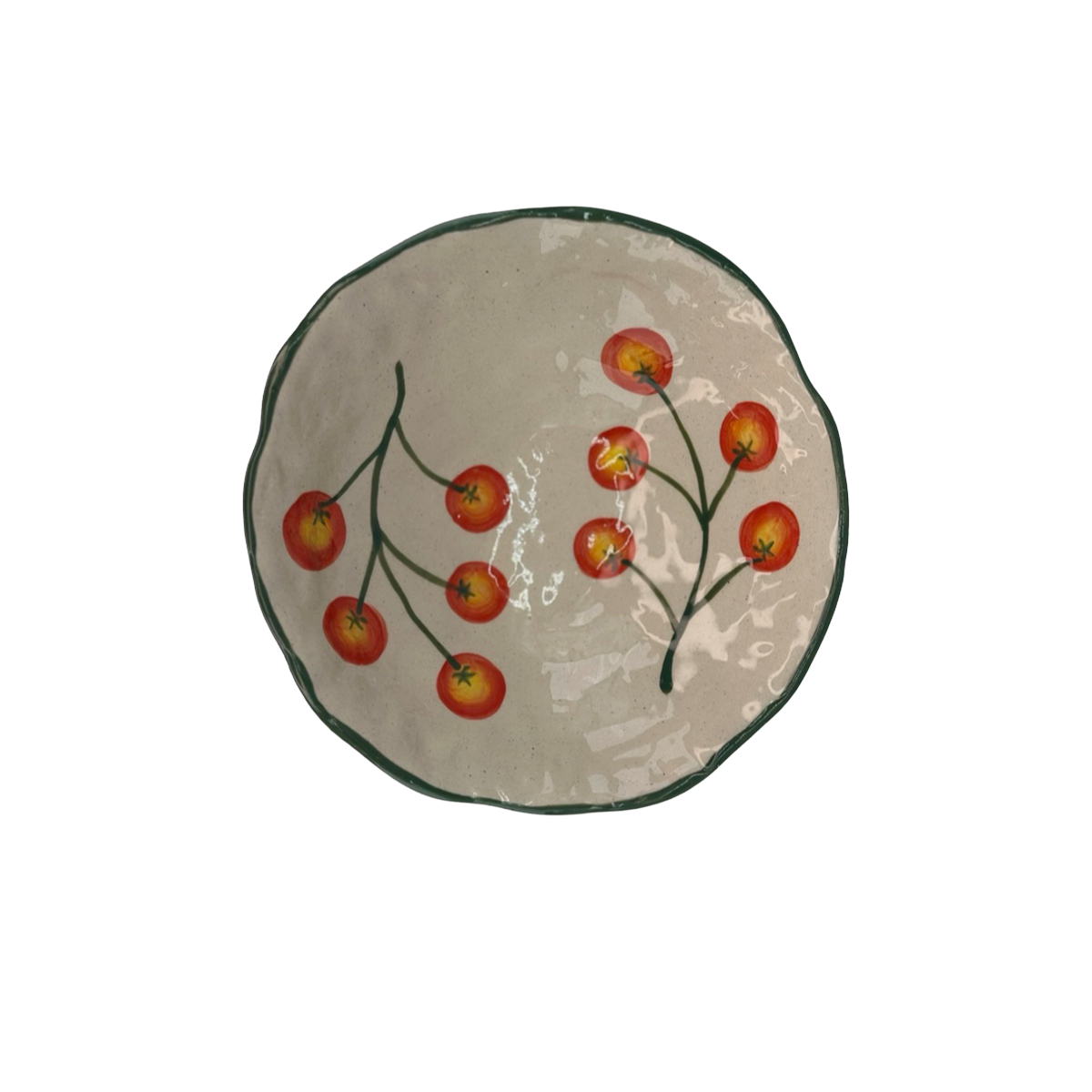 En vacker skål med handmålat mönster av kvisttomater. Varje skål är unikt handmålad, vilket ger den ett personligt uttryck och gör den till ett riktigt fin detalj att servera på.