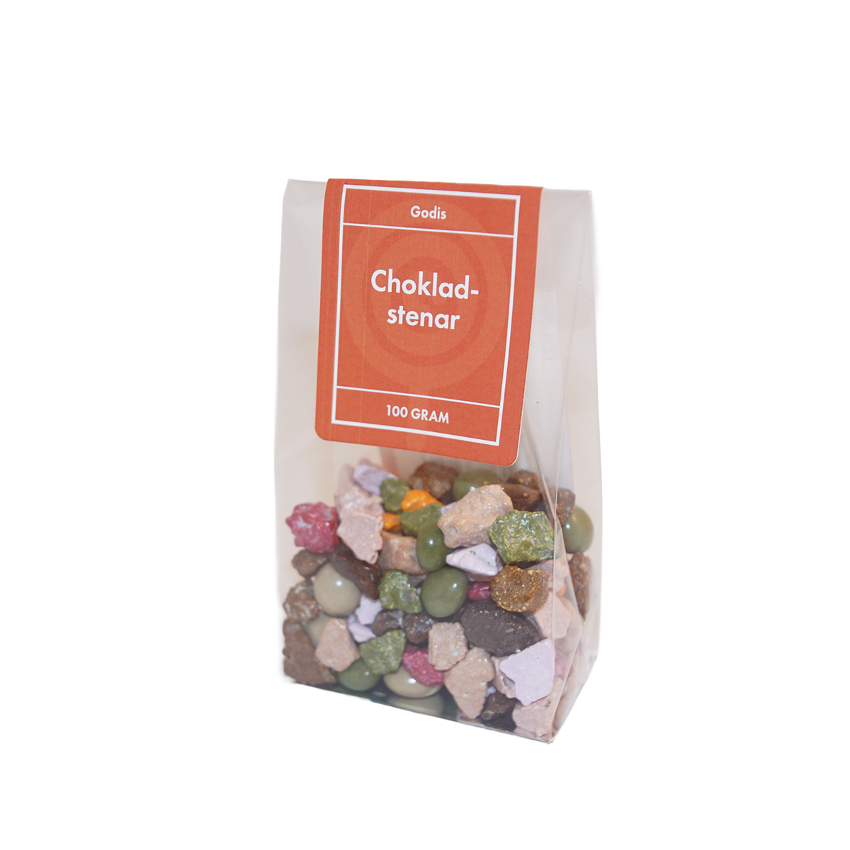 Ingredienser: Socker, palmolja, kakaopulver, maltodextrin, förtjockningsmedel (E414),emulgeringsmedel (SOJALECITIN), färgämnen (E150,E160c,E140, E163,E120,E100), ytbehandlingsmedel (E903) och arom
