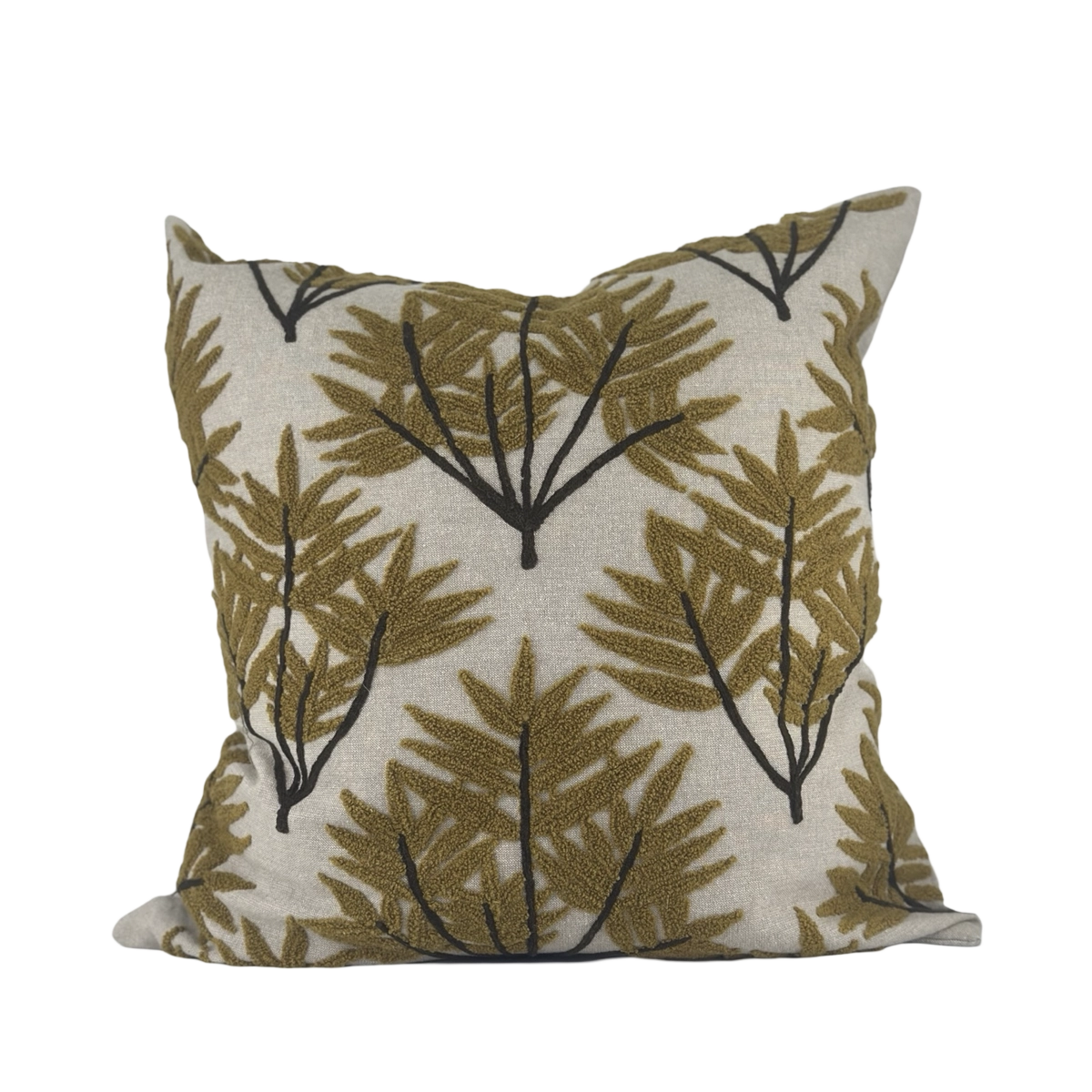 Broderad kudde med grafiskt bladmotiv i senapsgult och svart mot en naturfärgad botten. En stilren och taktil inredningsdetalj med höstkänsla. Material: 100% bomull. Tvättråd:Kemtvätt