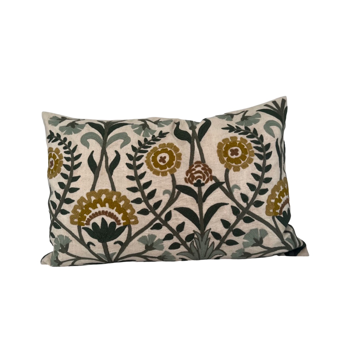 Broderad kudde med vackert motiv i härliga färger mot en naturfärgad botten. En dekorativ detalj som skapar en personlig känsla. Brodyr endast på framsidan.