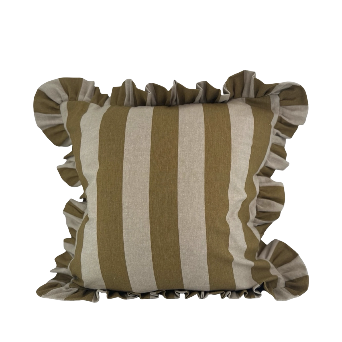Kuddfodral med blockrand och volang i kanten. Tillverkad i 100% bomull. Tvättas i 30 grader.