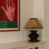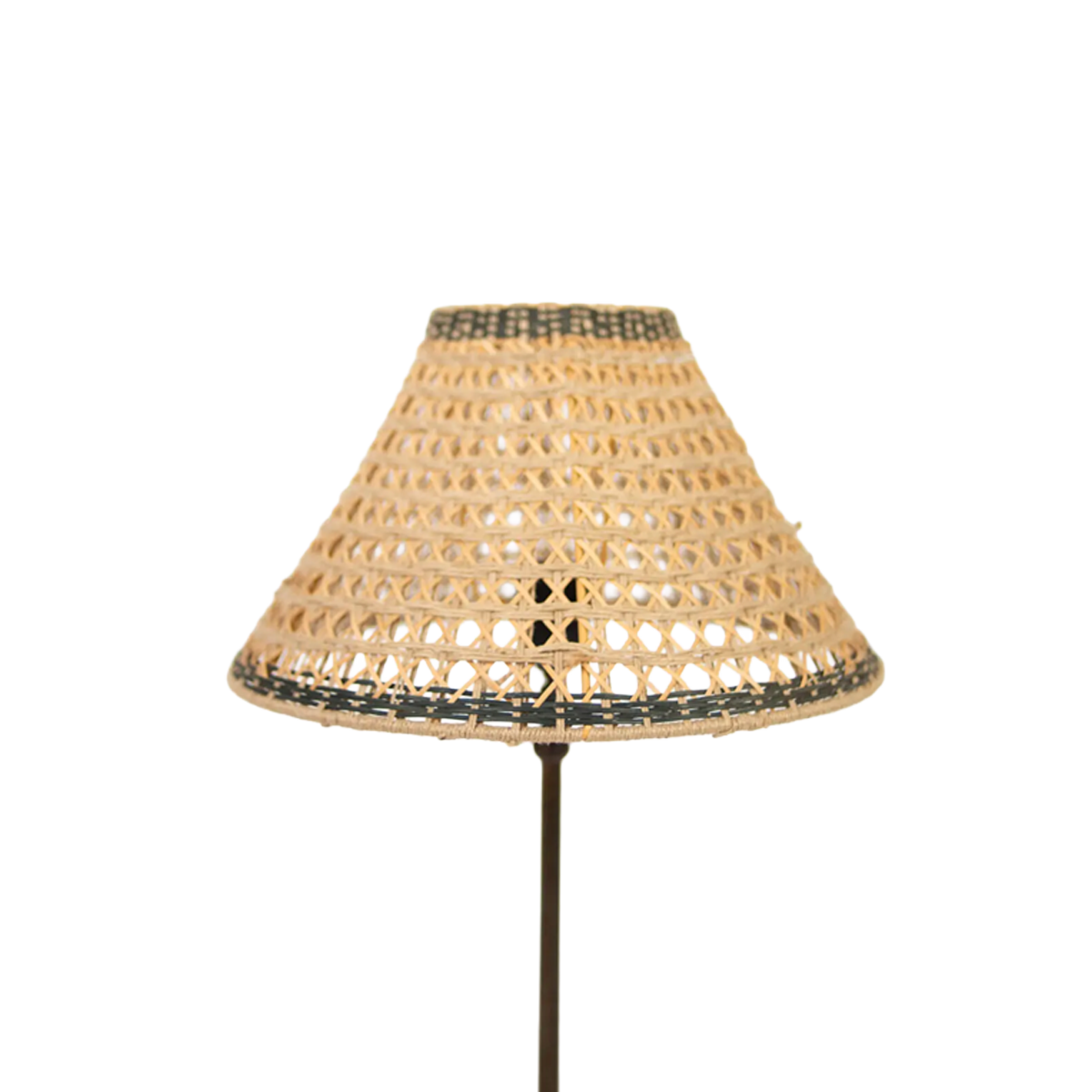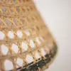 Lampskärm i rotting och jute som sprider ett mjukt och vackert sken genom dess öppningar.