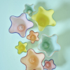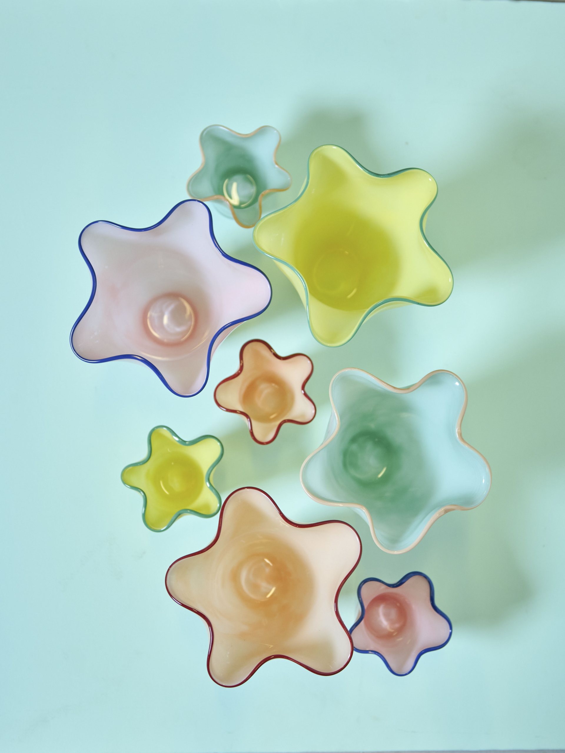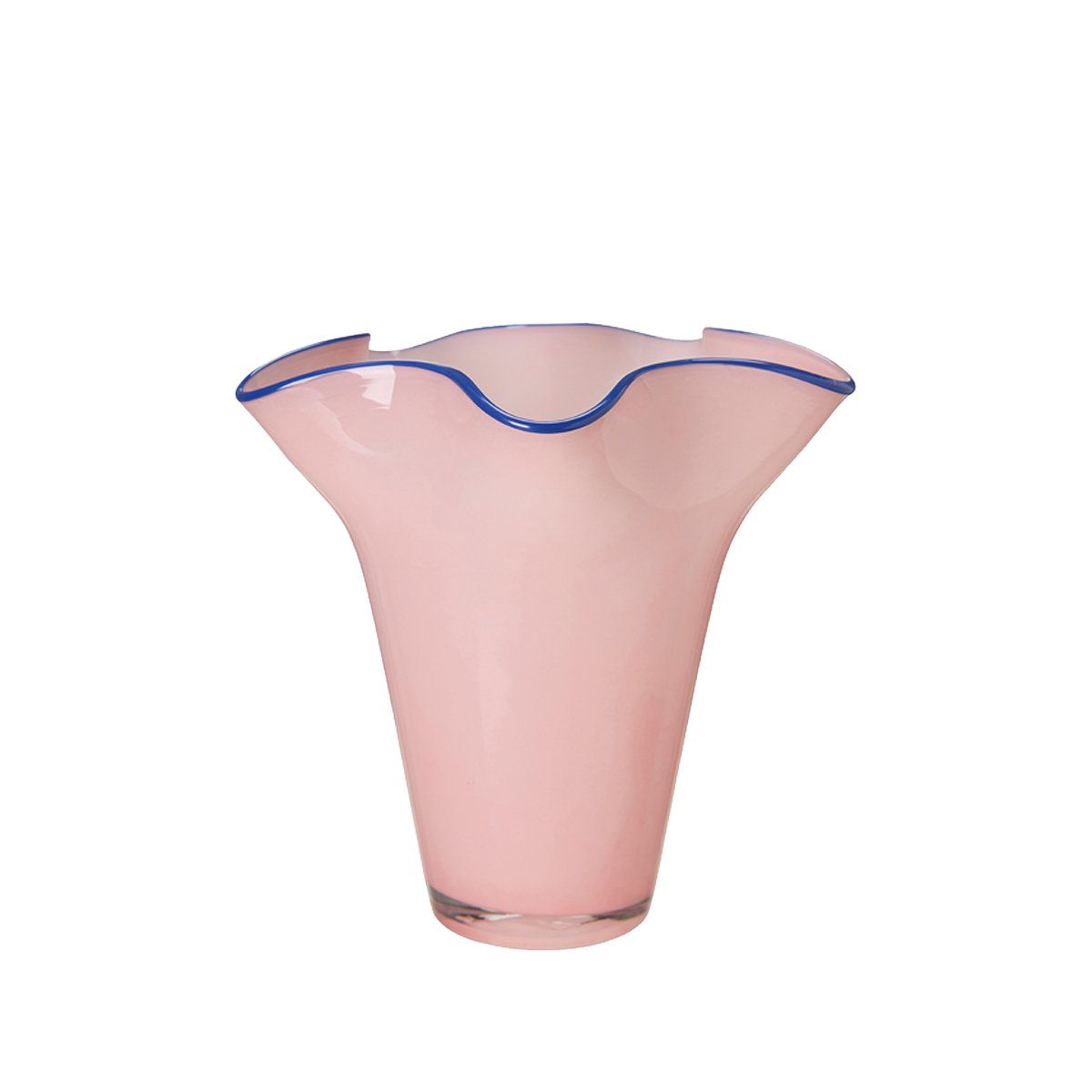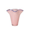 Rosa vas med blå detalj och vågiga former.