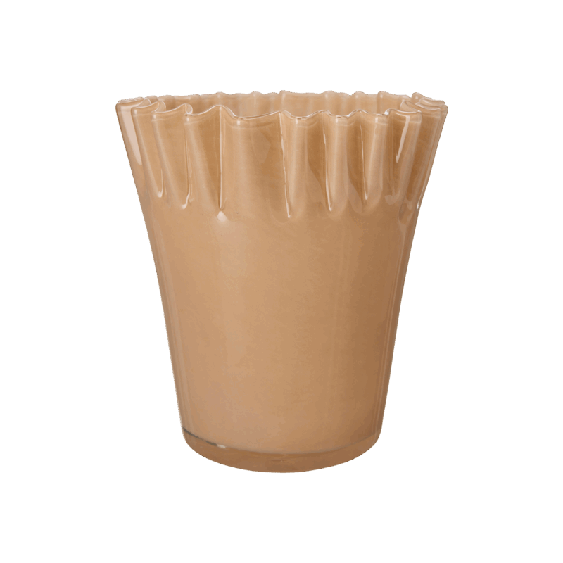 En charmig vas i glas med mjukt veckad kant som ger ett lekfullt och samtidigt stilfullt uttryck.