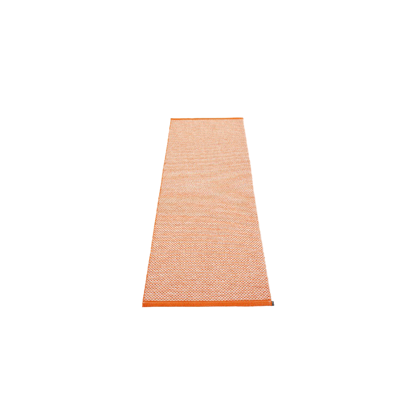 EFFI – modern enkelhet och kompromisslös komfort. Med sina rena linjer och diskreta elegans kompletterar EFFI enkelt en mängd olika inredningsstilar. Vävd i vår unika teknik är denna matta ett verkligt bevis på Pappelinas enastående hantverk och uppmärksamhet på detaljer. En vävteknik som gör EFFI extra mjuk och skön att gå på. Hemligheten hos EFFI ligger i dess minimalistiska charm. Fri från onödig utsmyckning omfamnar den konceptet ”less is more” Den trefärgade blandningen ger djup och dimension till designen och skapar ett visuellt intressant mönster trots sin enkelhet. Oavsett om du väljer en djärv och levande kombination eller föredrar en mer nedtonad palett, kommer EFFI att lägga till en touch av modern sofistikation i ditt hem. Den fållade kanten är den perfekta sista touchen, som inte bara ger en raffinerad estetik utan också hållbarhet och lång livslängd, en matta som passar perfekt för utomhusbruk. Mattan är hygienisk, absorberar ej vätska, samt dammar inte. Idealisk för personer med allergier. Pappelina plastmatta EFFI Orange Piglet Vanilla