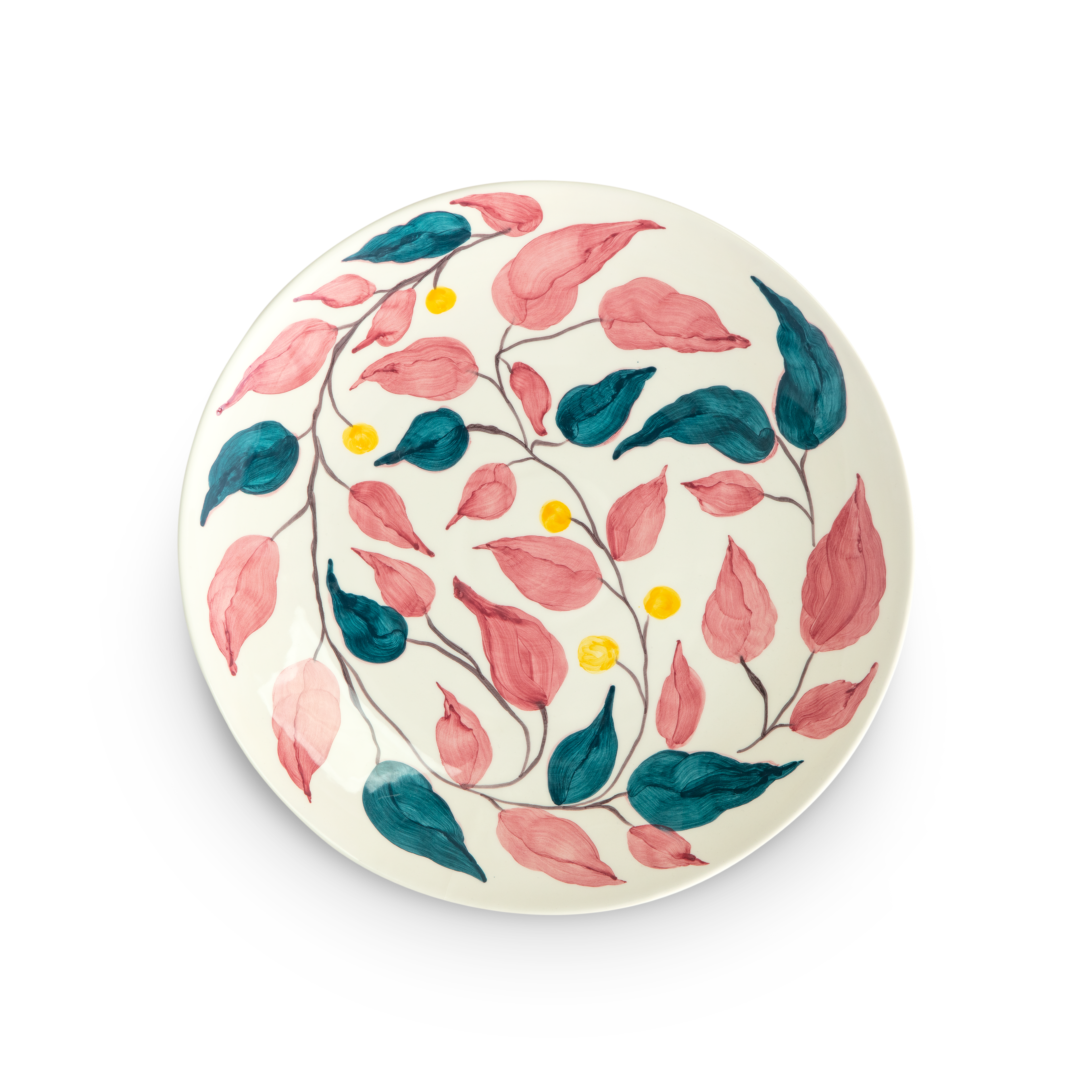 Detta uppläggningsfat, dekorerat med ett handmålat bladmotiv inspirerat av naturens skönhet, är lika vackert som dekorativ detalj som praktiskt serveringsfat till middagar med nära och kära. Kombinera med produkter från andra Mateuskollektioner eller mixa med delar från Flowerskollektionen för en personlig stil. Perfekt för servering vid bjudningar eller som fruktfat – en fin gåva till både vänner och familj.