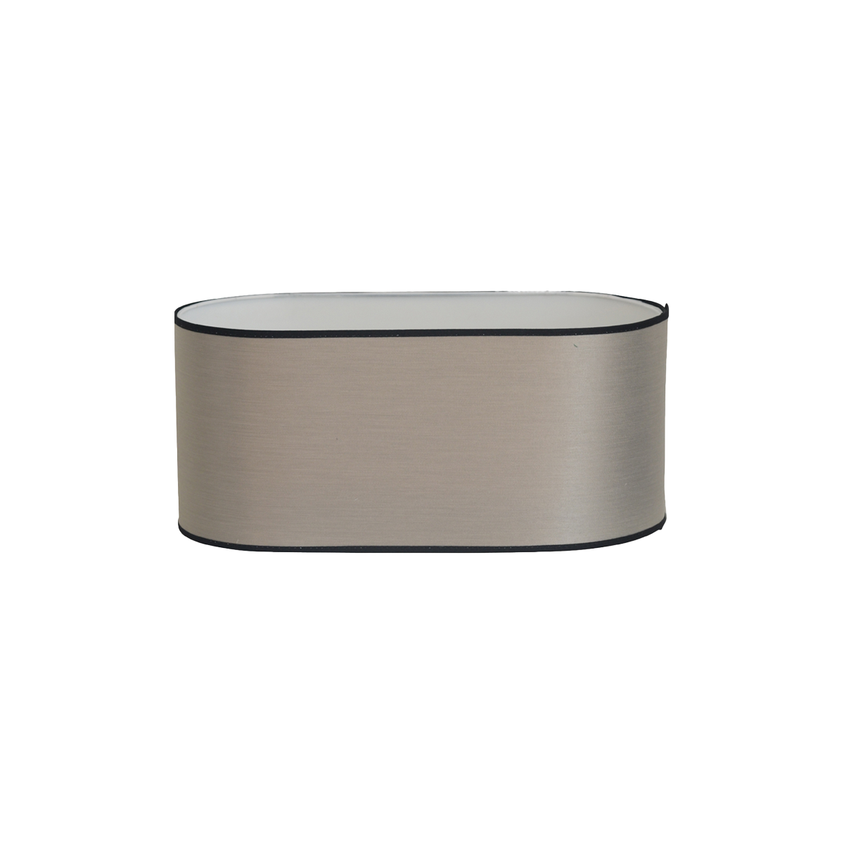 En avlång, trendig lampskärm med en oval form. I neutrala färger i textil, ger den ett stilrent och mjukt ljus, perfekt för minimalistiska miljöer.