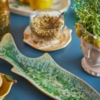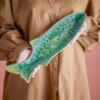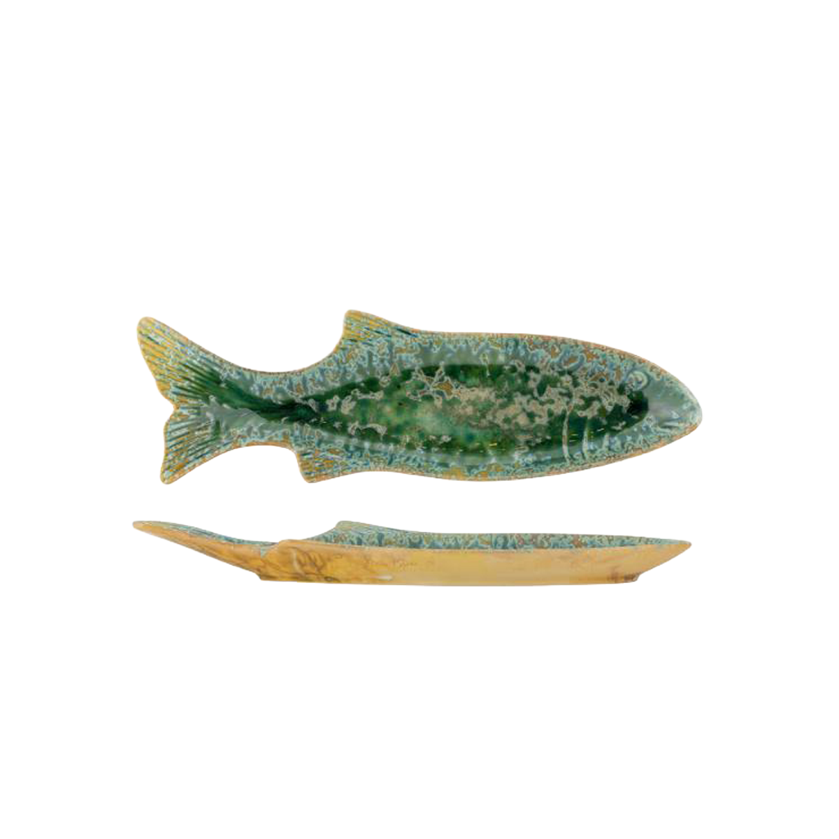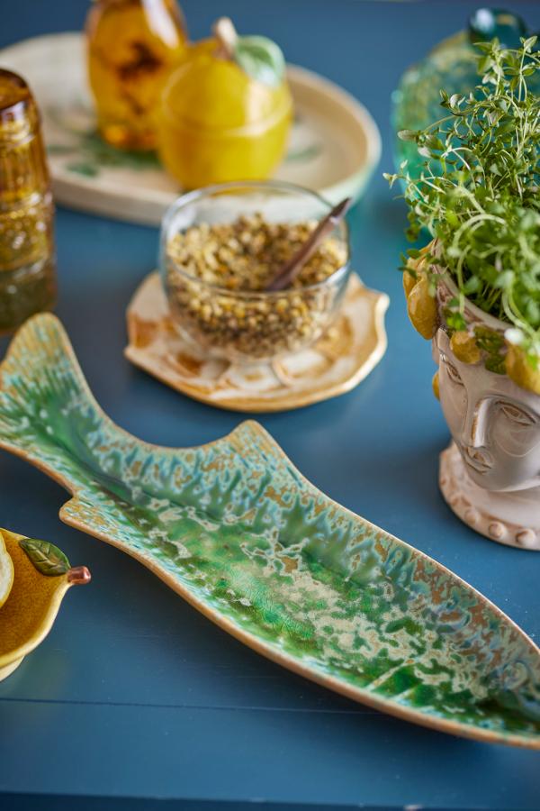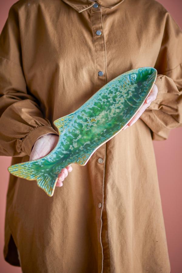 Hadden serveringsfat är tillverkat av stengods och formad som en fisk. Den gröna reaktiva glasyren skapar subtila färgvariationer och ger varje fat ett unikt utseende. Perfekt för små portioner eller som dekoration.