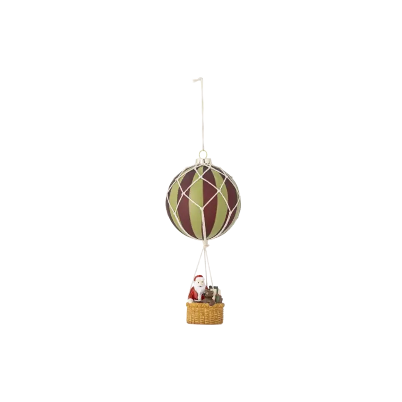 Julgranskulan Hettie från Bloomingville är en rolig och charmig juldekoration som föreställer en ballong med en korg under, där en liten jultomtefigur sitter. Figuren är gjord av polyresin, medan själva bollen är gjord av glas. Julgranskulan hänger elegant på en gyllene tråd och är perfekt att hänga i julgranen.