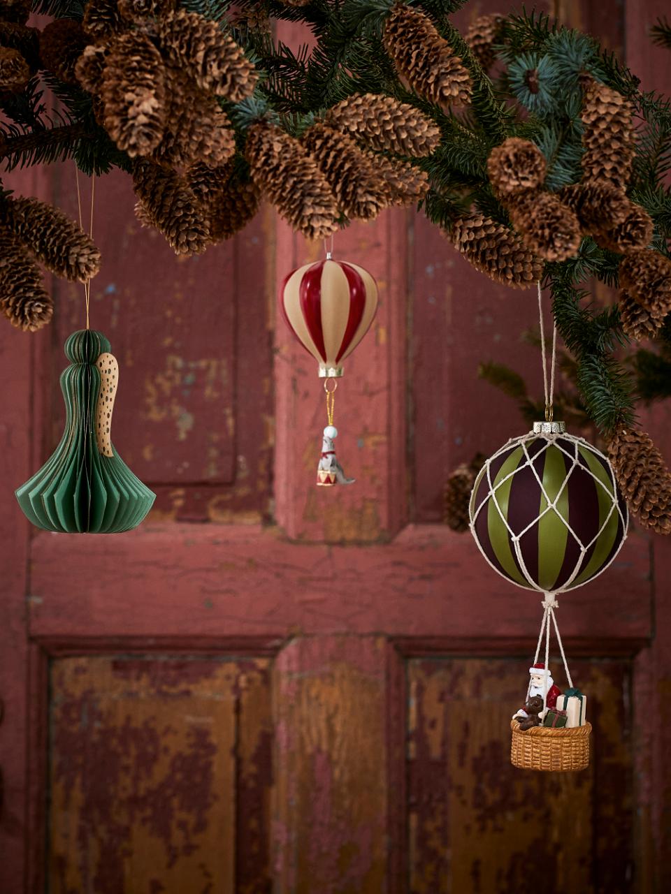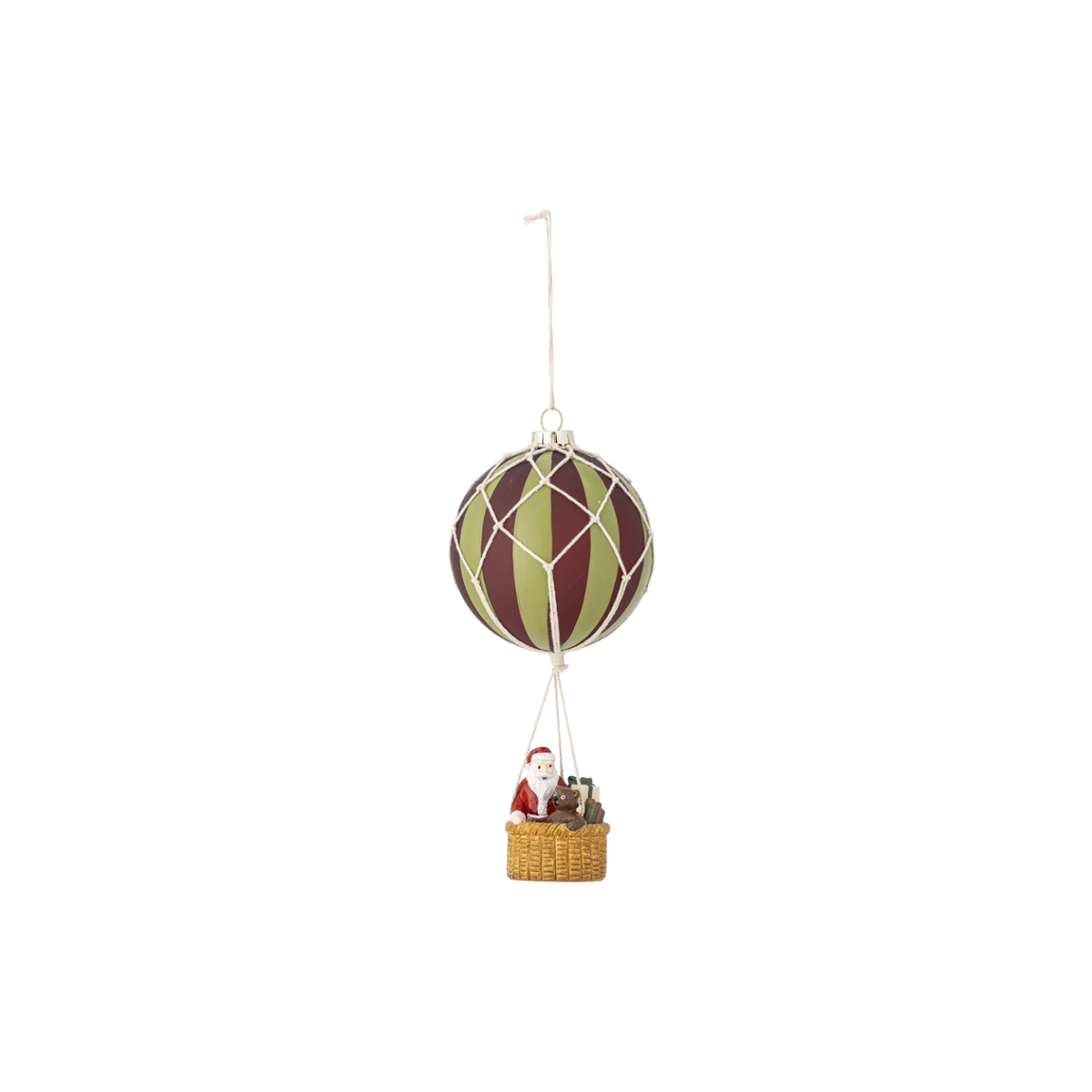 The Hettie Ornament by Bloomingville is a fun and charming Christmas decoration depicting a balloon with a basket underneath where a little Santa Claus figure sits. The figure is made of polyresin, while the ball is made of glass. Hanging elegantly on a golden thread, it is perfect for adorning the Christmas tree.