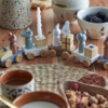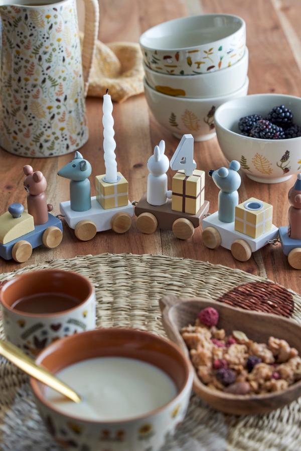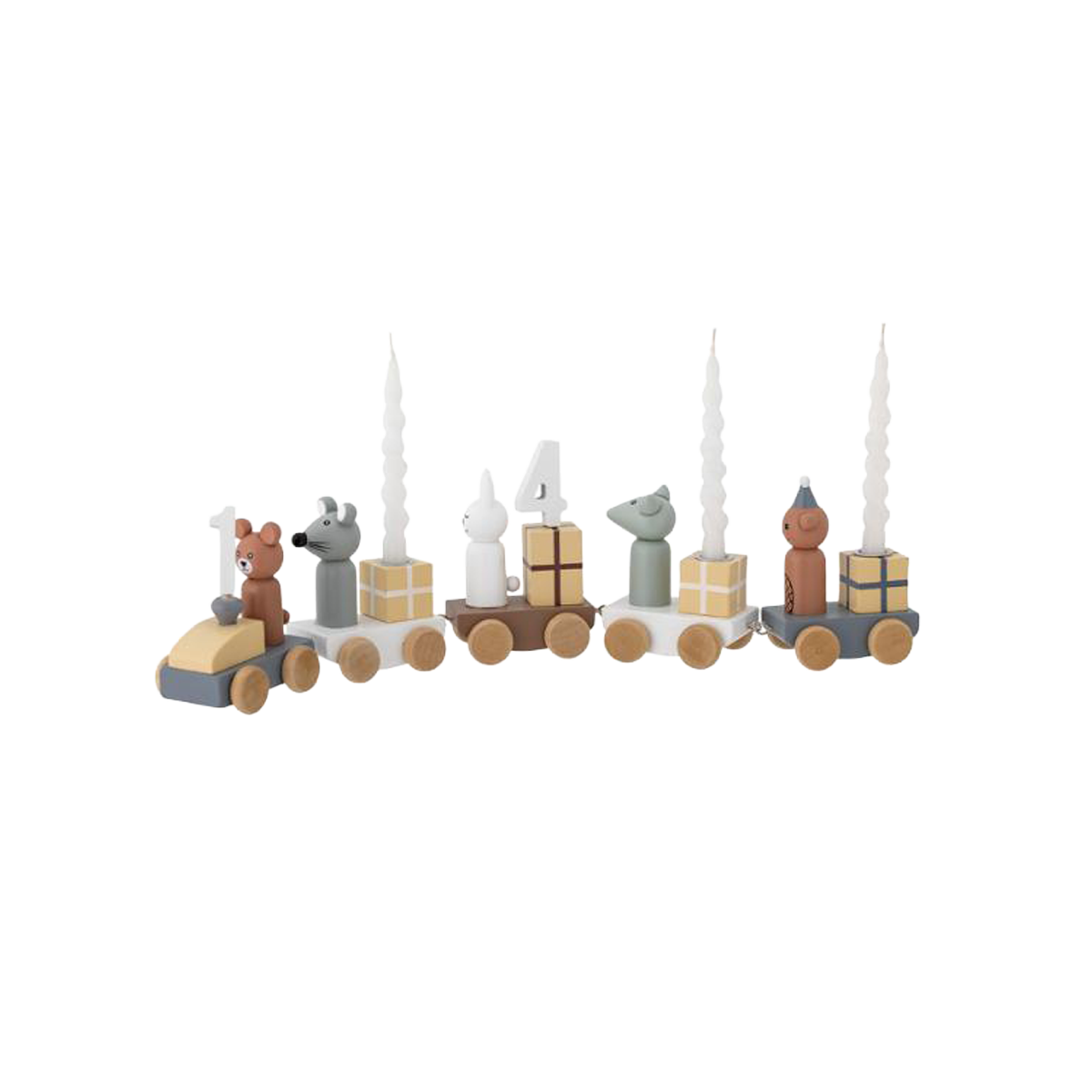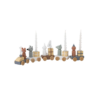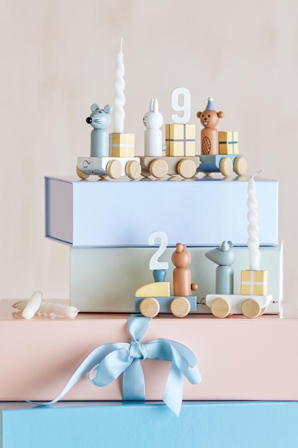 Födelsedagsdekorationen gör födelsedagsfirandet extra speciellt. Det festliga födelsedagståget består av fem vagnar med söta presenter och djur i vackra färger. Det charmiga tåget har siffror från 0-9, har plats för tre ljus och kan användas som dekoration i barnrummet året runt. Tåget, tillverkat av FSC-certifierat trä, kommer i en fin presentask och är den perfekta babyshower eller doppresenten.