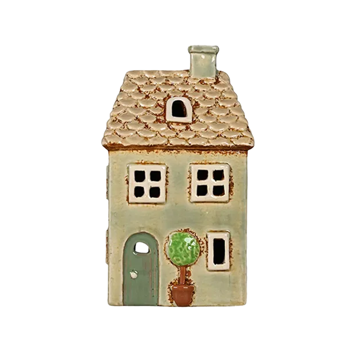 Trendiga Danska keramikhus för värmeljus. Blågrått med tegelpannstak.