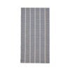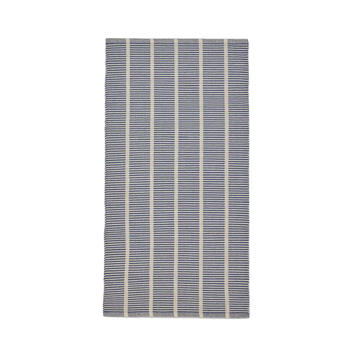 Lagan är en blå matta med vita ränder i en enkel men karaktärsfull design. Mönstret ger en fräsch och stilren känsla, samtidigt som de vävda strukturerna tillför djup och liv.