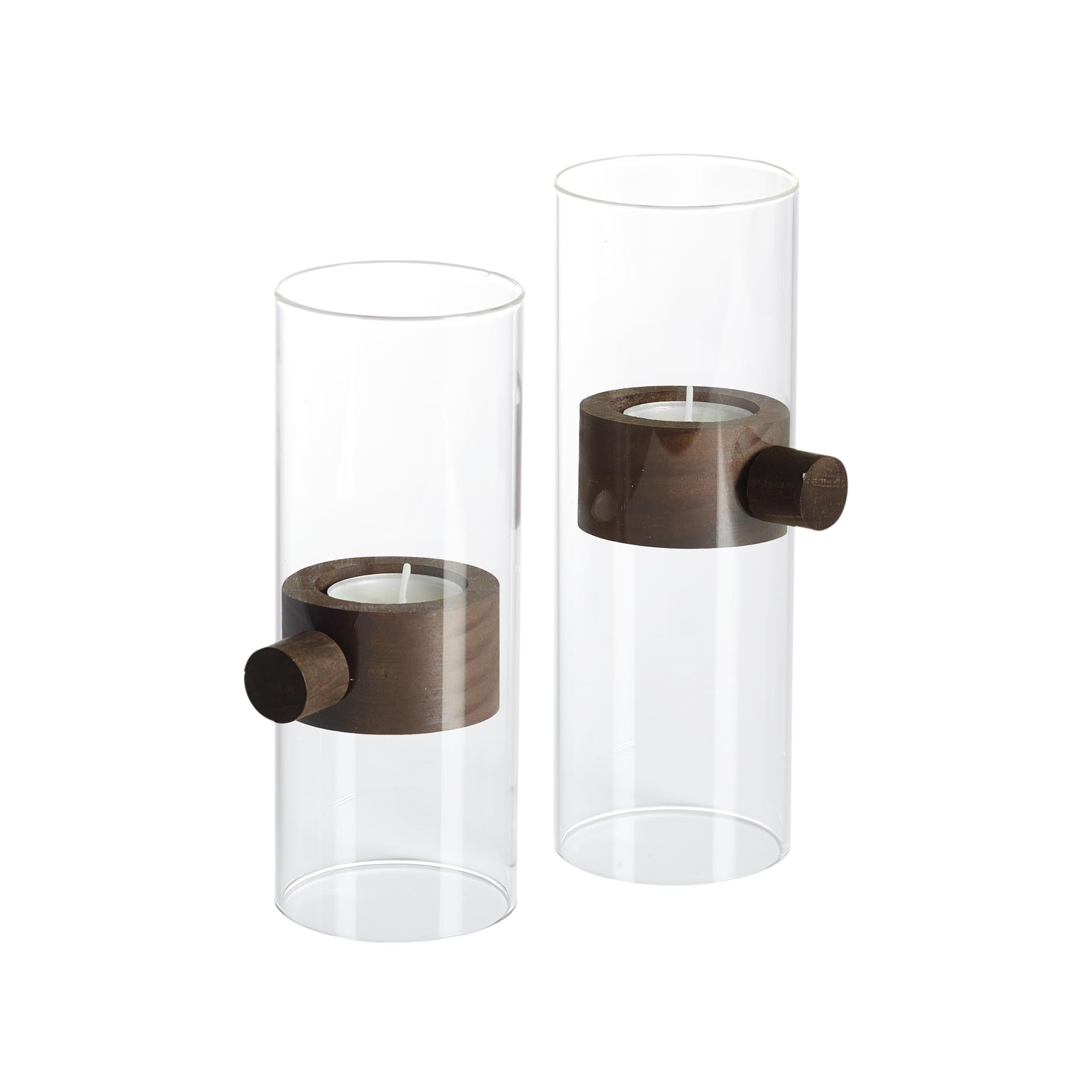 Set med 2 ljuslyktor i glas och ljushållare i trä från Mogihome. Ljushållarna fästs med i magnet i önskad höjd och du kan därför sätta din personliga prägel. Dessa lyktor ger ett stilrent intryck i ditt hem.