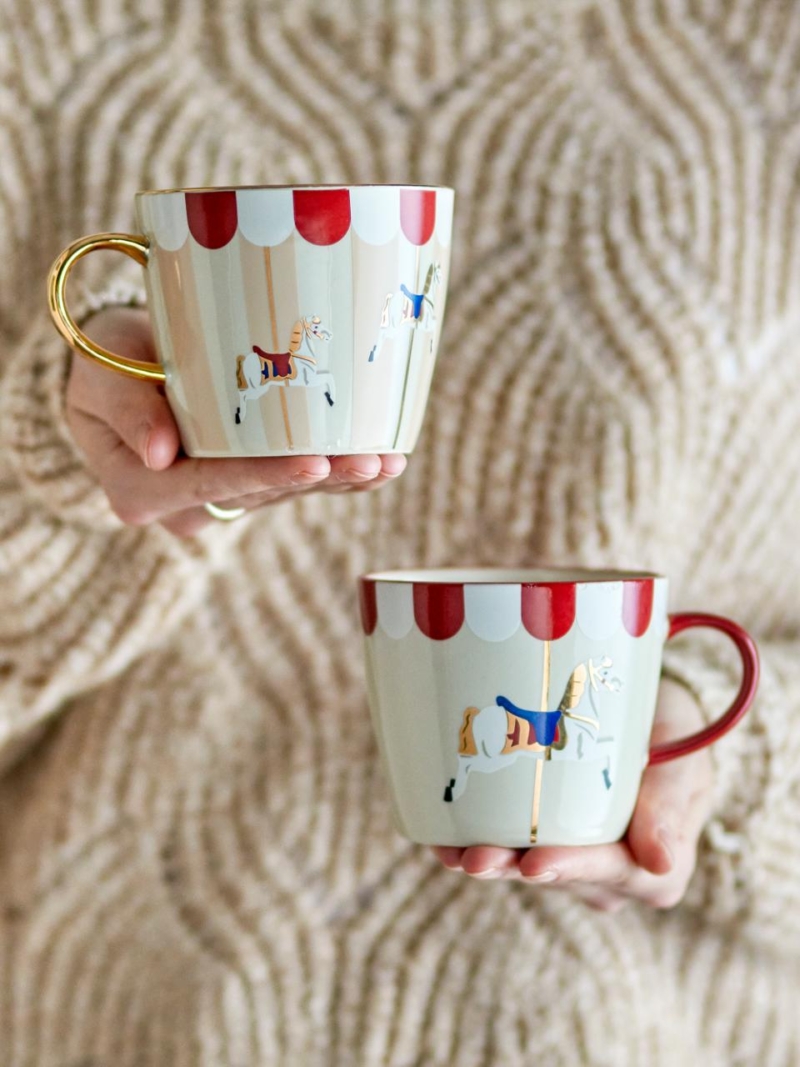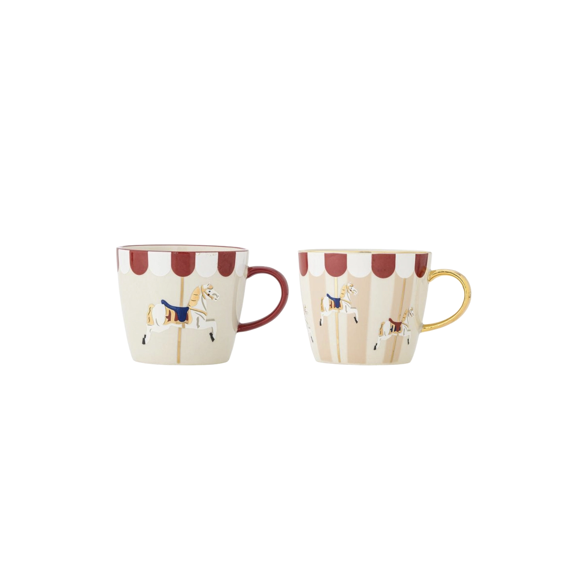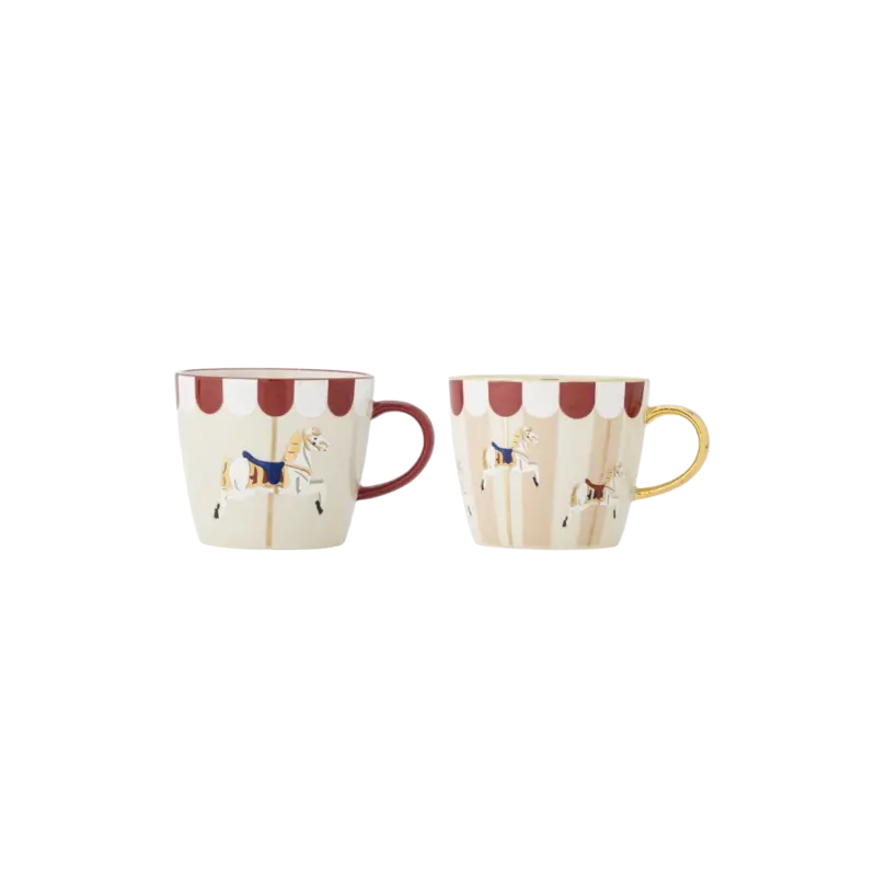 The Merry-go-round Mug by Bloomingville is a charming set of two cups, decorated with a festive carousel pattern. The motifs are hand-painted, and one cup features a beautiful gold effect on the handle. Perfect for enjoying warm drinks and creating a cozy atmosphere during the Christmas season. The hand-painted details give each mug a unique expression.