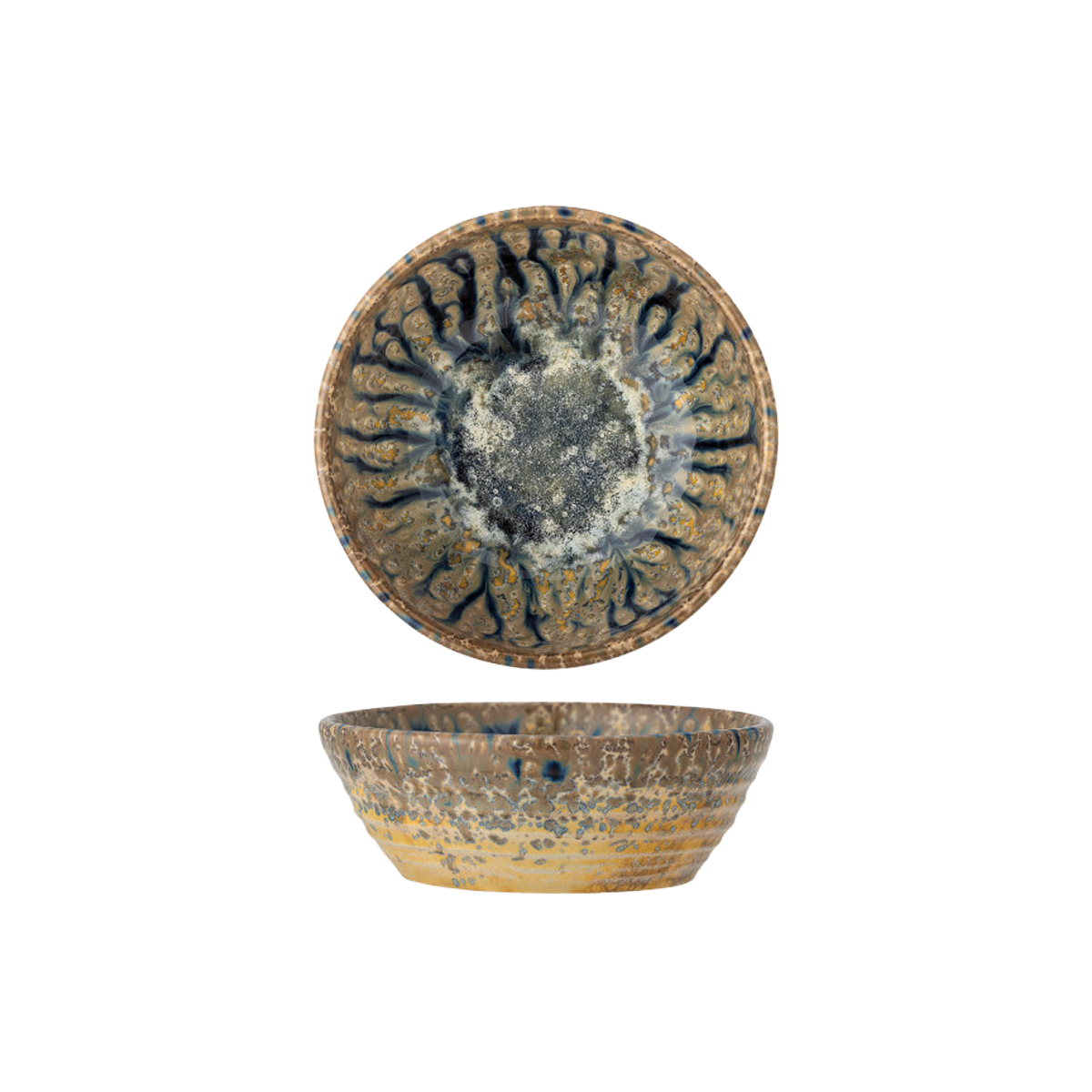 Milani skål är handgjord och har en reaktiv glasyr som skapar variationer i färger och mönster vilket gör varje skål unik. Perfekt för servering eller som ett dekorativ tillskott i vardagsrummet.