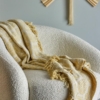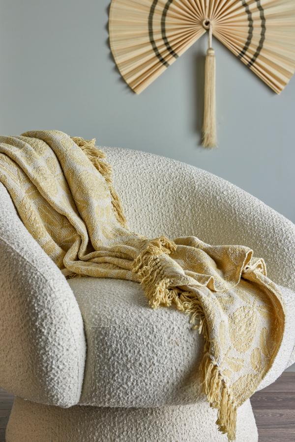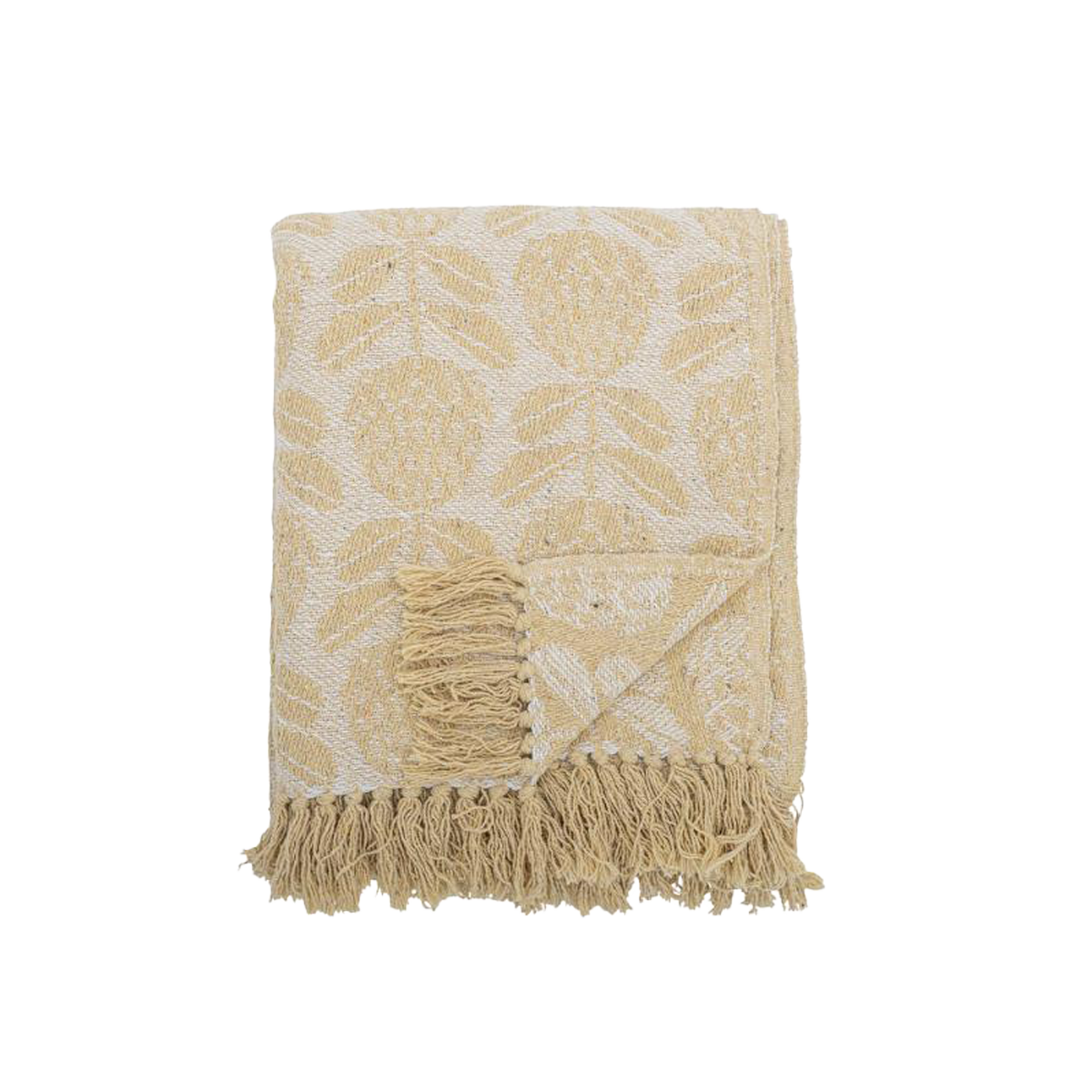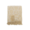 Pratello pläden är en vävd bomullstextil med ett symmetriskt lövmotiv i varmt gult på en mjuk krämfärgad bakgrund. Med vävt tyg och mönster på båda sidor har den en mjukt texturerad yta och långa, tätt rynkade fransar för en avslappnad look.
