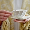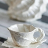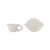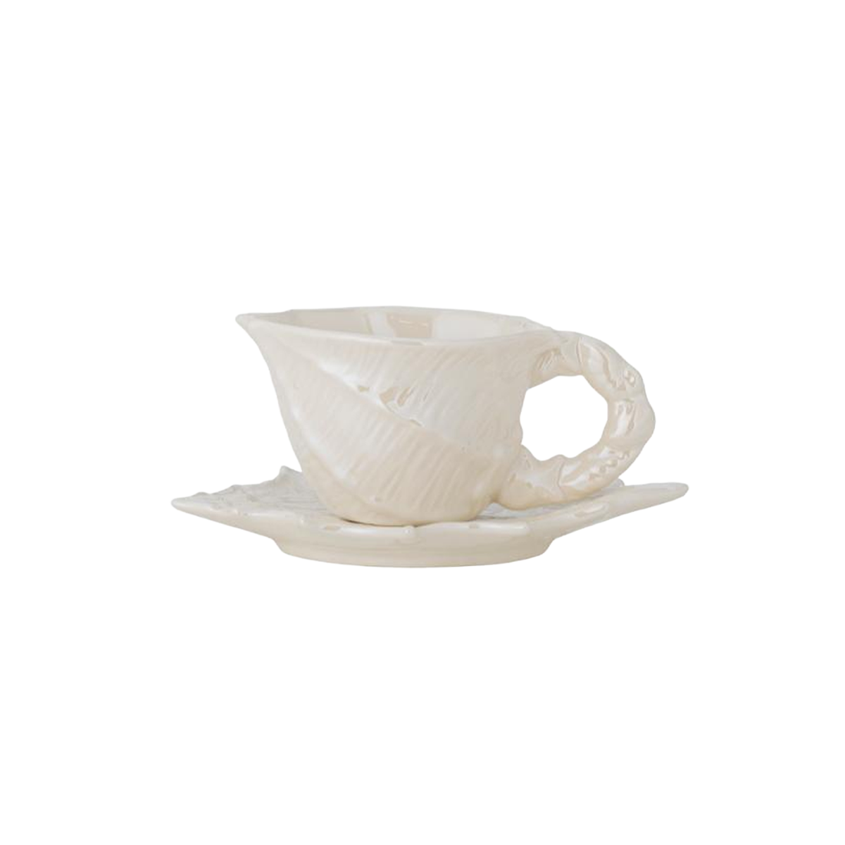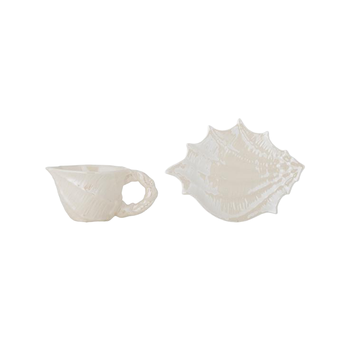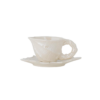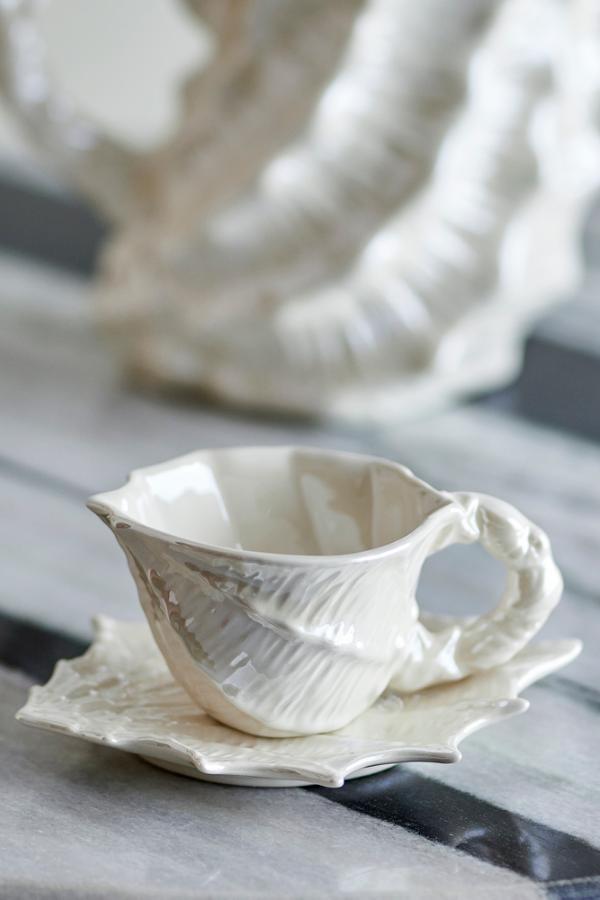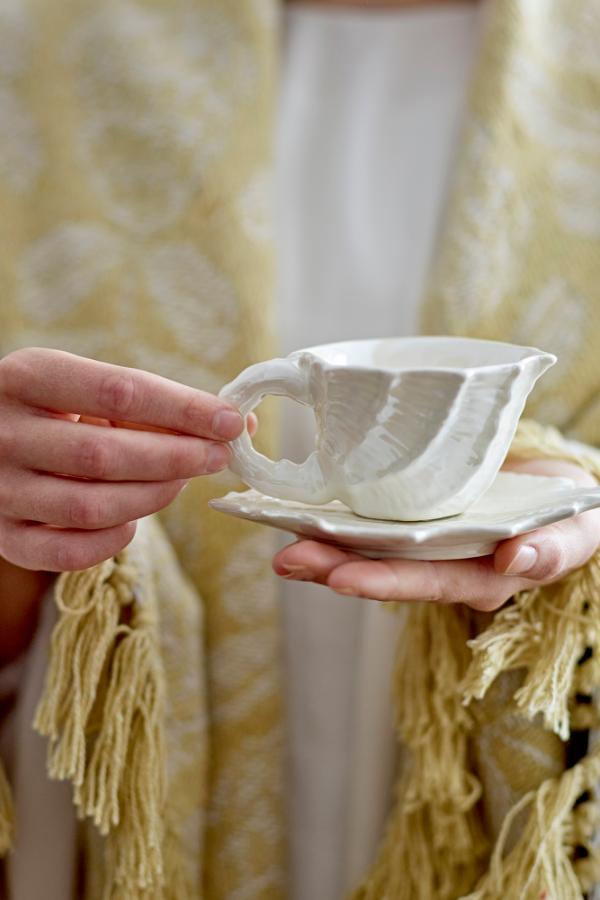Shellie-koppen med fat från Bloomingville är ett set i stengods med en vit elektropläterad yta som vackert reflekterar ljuset. Den naturliga strukturen är inspirerad av snäckor och kompletteras av ett skulpturalt handtag med vridna linjer samt ett vågigt fat som elegant framhäver det flytande uttrycket.