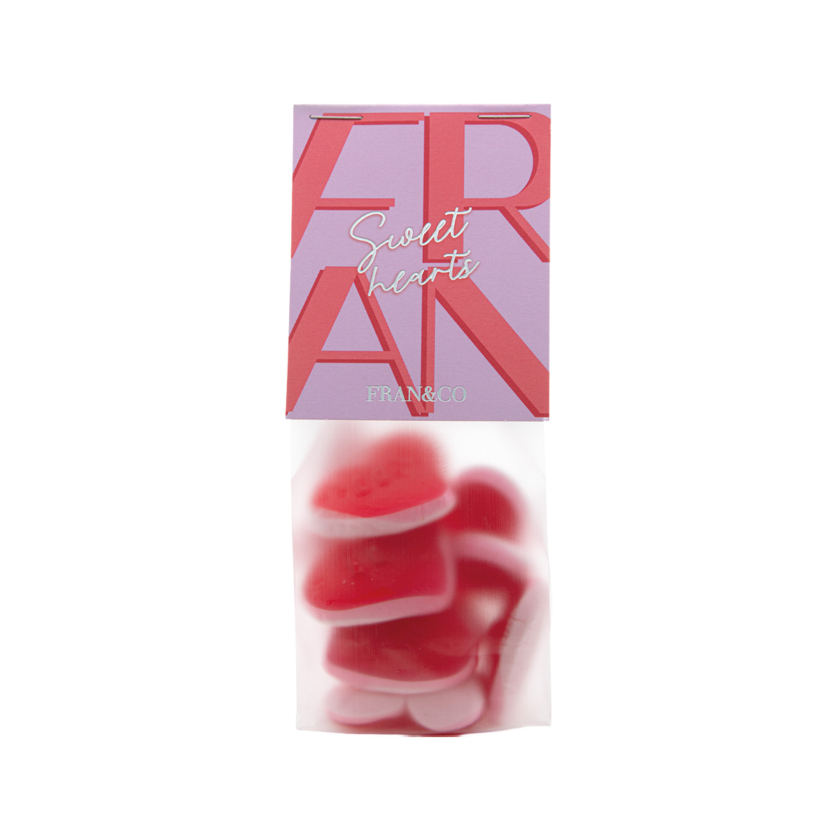 Sockrad gelé med smak av hallon. Ingredienser: Socker, glukos-fruktossirap, vatten, gelatin, fuktighetsbevarande medel (sorbitol), surhetsreglerande medel (äppelsyra) aromämne, färgämne (E120).
