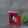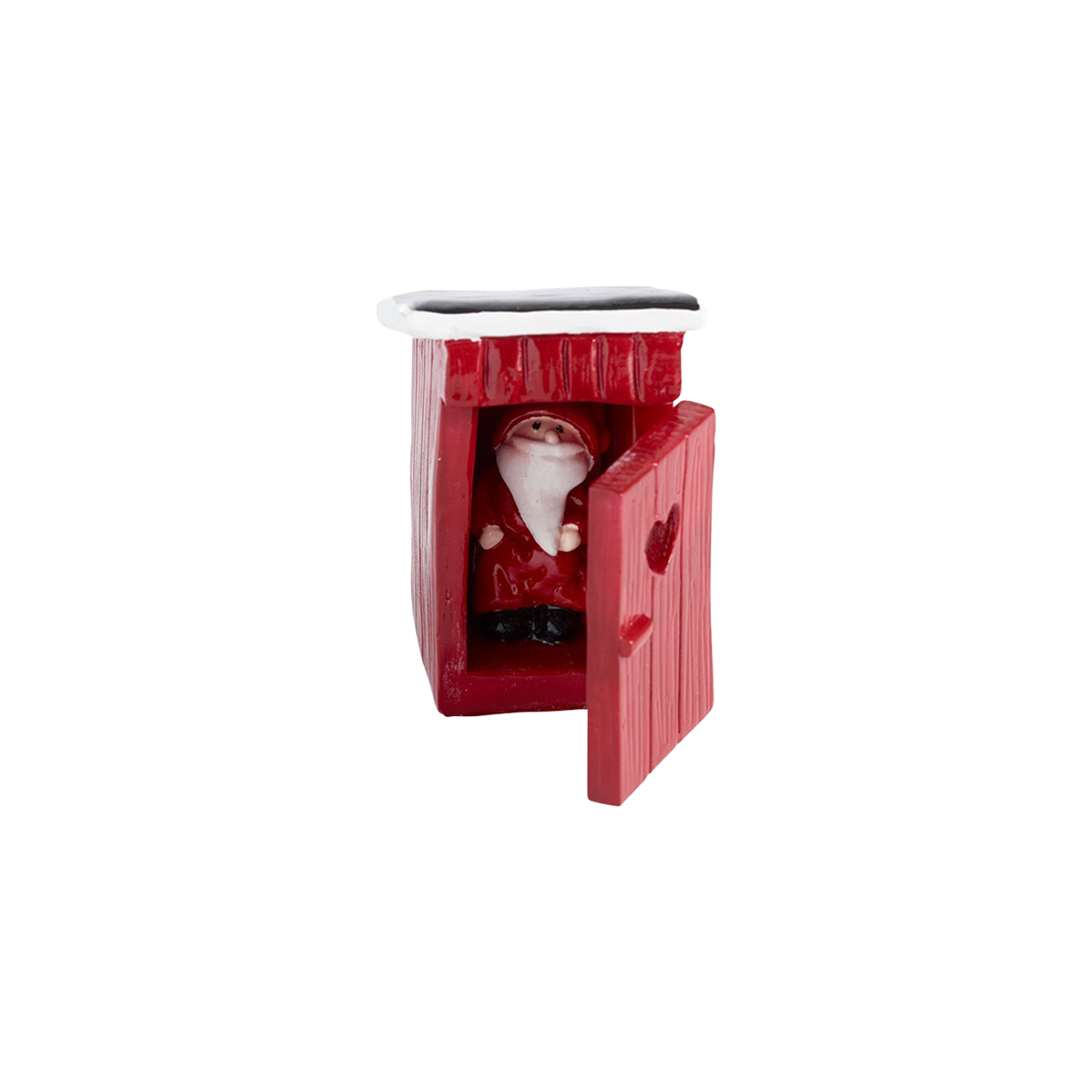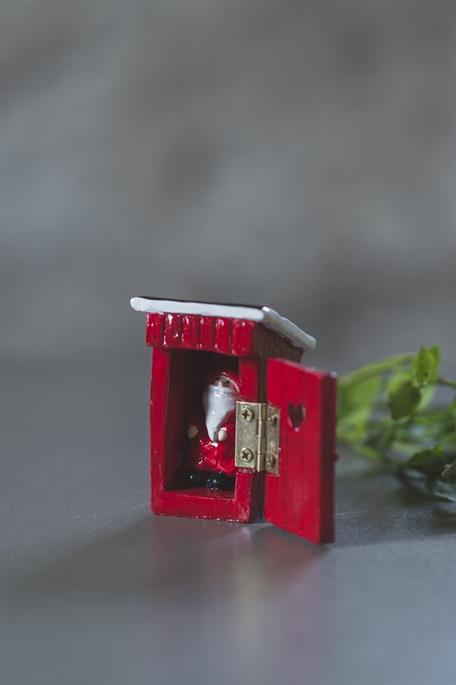 Tomtesson sprider julstämning med glimten i ögat. Här sitter han på det fint målade utedasset.