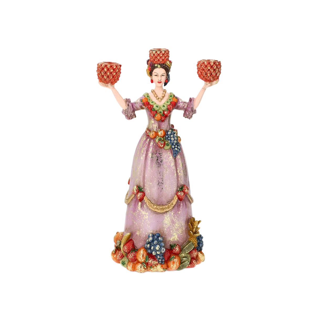 Inred med elegans och lekfullhet med en fin trearmad ljusstake föreställande en kvinna i klänning med olika frukter. Tillverkad i poly.
