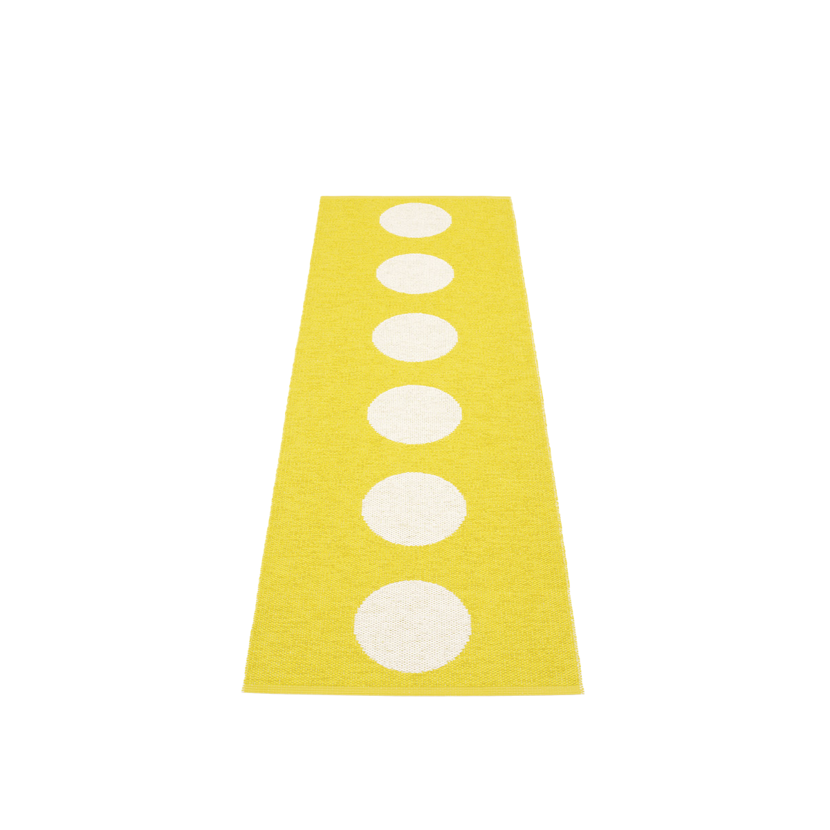 Allt började med VERA! Sedan sin debut har VERA uppnått enastående framgång och sålt över 150 000 mattor över hela världen. Dess ikoniska design fortsätter att skänka glädje och karaktär till otaliga hem runt om i världen. VERA förmår väcka en känsla av lekfullhet och samtida charm, vilket gör den till en älskad min punkt i hemmet. När VERA lanserades i augusti 2002 introducerade den ett banbrytande designkoncept i mattvärlden. Med sin stora runda cirkel och unika två-i-en-koncept fångade VERA publiken med sitt innovativa tillvägagångssätt för färgsättning. Genom att helt enkelt vända på mattan kunde man förändra utseendet på mattan och tillföra en lekfull twist till det samtida mönstret. Med övertygelse om att detta var ett mönster som skulle skap en egen trend och stå emot tidens tand släppte Pappelina VERA i åtta fängslande färger: Svart, Vit, Röd, Grön, Blå, Nougat, Orange och Grå. Bland dessa ursprungliga nyanser förblir Svart, Röd och Orange populära val än idag, vilket är ett bevis på deras tidlösa attraktionskraft. Som en ikonisk och bästsäljande design symboliserar VERA Pappelinas engagemang för att driva gränserna för mattdesign samtidigt som den behåller en tidlös attraktionskraft. Mattan är hygienisk, absorberar ej vätska, samt dammar inte. Idealisk för personer med allergier. Pappelina plastmatta VERA Lemon Vanilla.