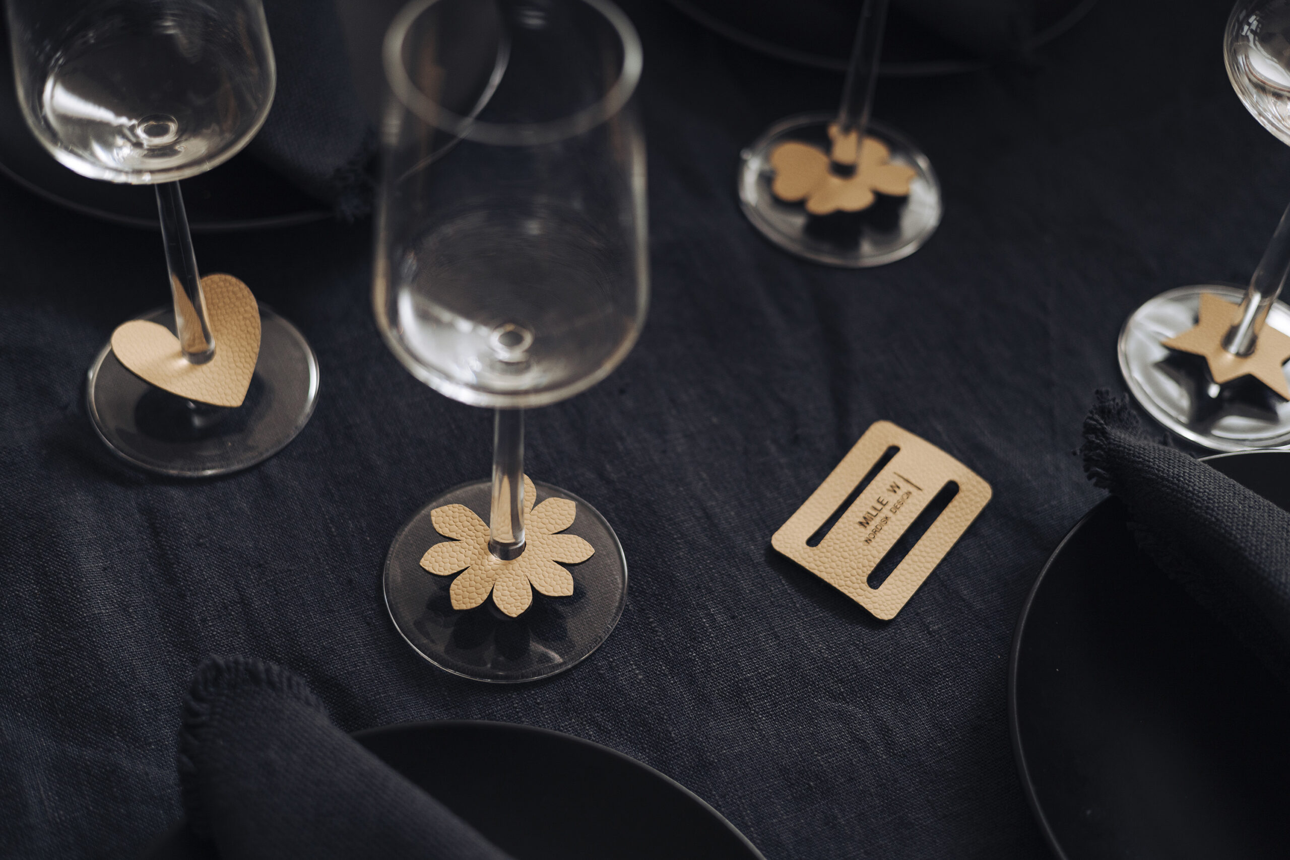 Glasmarkörer i nordisk design handgjord av återvunnet läder i Sverige. Ett vackert sätt att hålla ordning på sitt eget glas så att det inte förväxlas med någon annan.