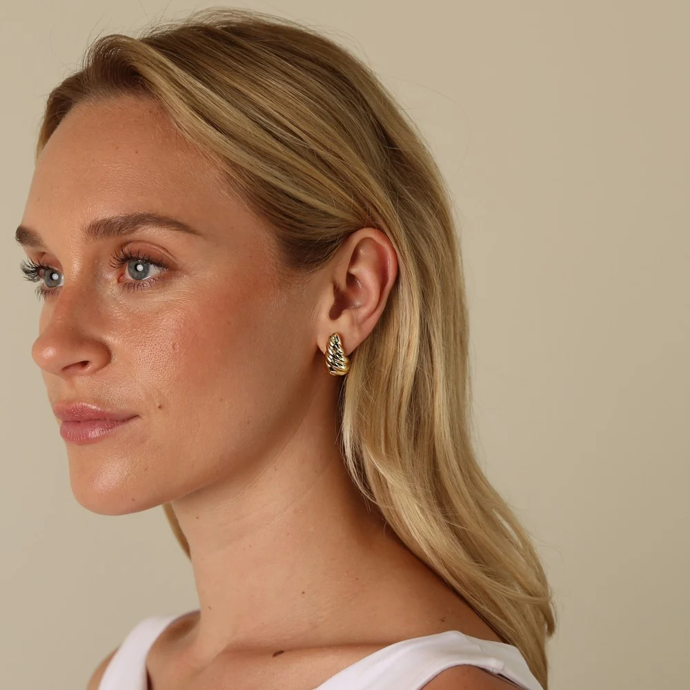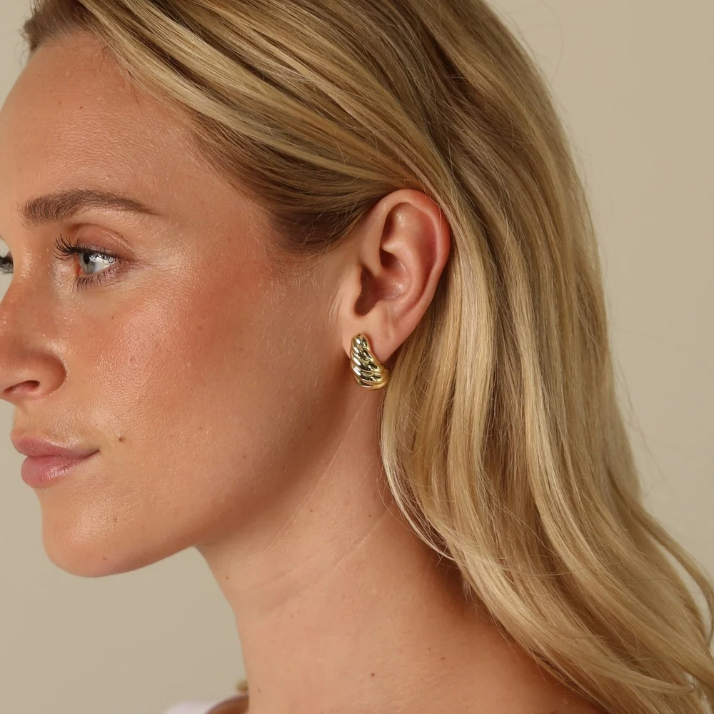 Örhängen med en droppformad, tvinnad design. Tillverkade i mässing med en 14k guld- eller sterling silverplätering.